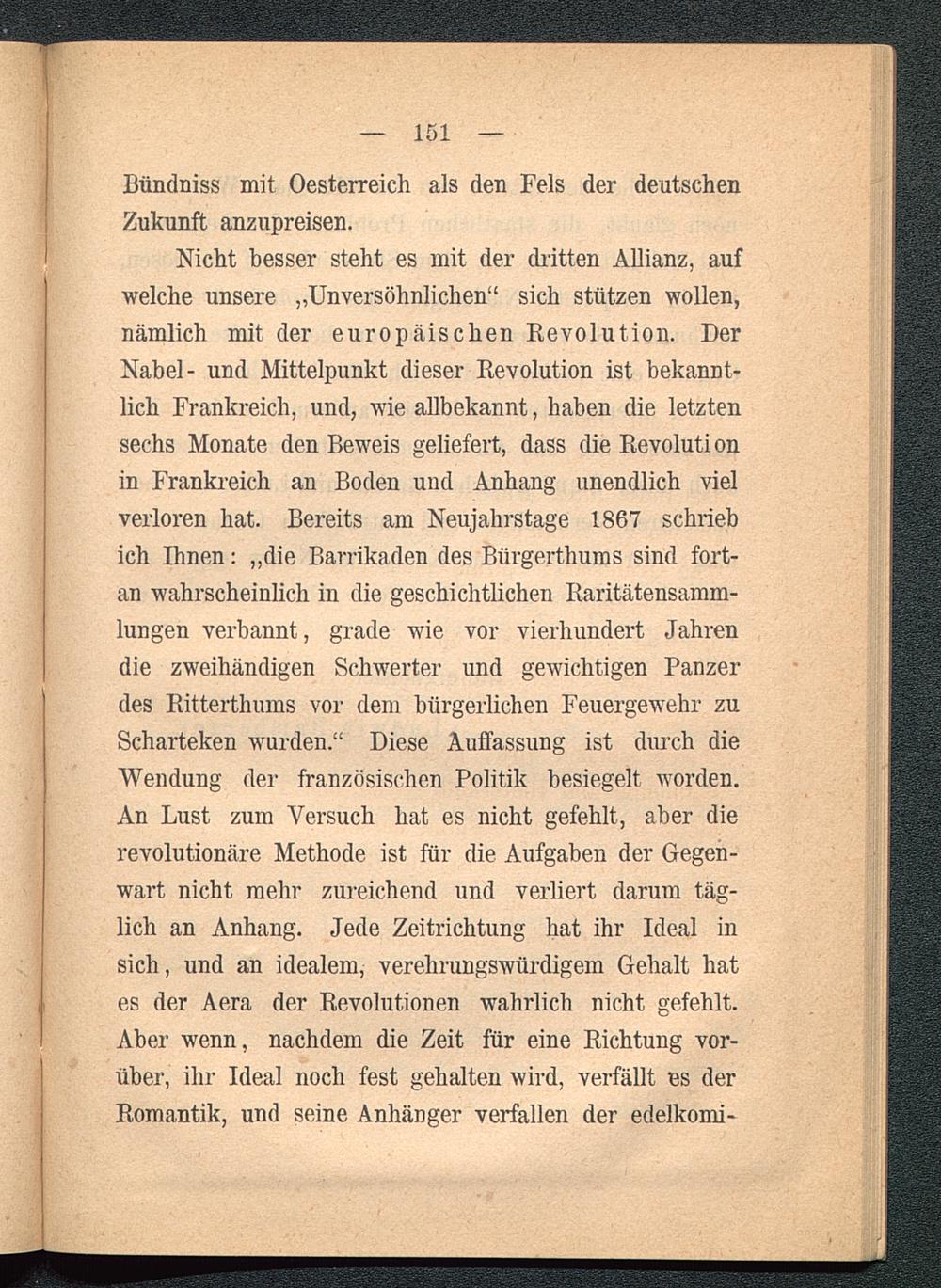 Nicht besser steht es mit der dritten Allianz, aufwelche unsere „Unversöhnlichen“ sich stützen wollen,nämlich mit der europäischen Revolution. DerNabel- und Mittelpunkt dieser Revolution ist bekannt-lich Frankreich, und, wie allbekannt, haben die letztensechs Monate den Beweis geliefert, dass die Revolutionin Frankreich an Boden und Anhang unendlich vielverloren hat. Bereits am Neujahrstage 1867 schriebich Ihnen: „die Barrikaden des Bürgerthums sind fort-an wahrscheinlich in die geschichtlichen Raritätensamm-lungen verbannt, grade wie vor vierhundert Jahrendie zweihändigen Schwerter und gewichtigen Panzerdes Ritterthums vor dem bürgerlichen Feuergewehr zuScharteken wurden.“ Diese Auffassung ist durch dieWendung der französischen Politik besiegelt worden.An Lust zum Versuch hat es nicht gefehlt, aber dierevolutionäre Methode ist für die Aufgaben der Gegen-wart nicht mehr zureichend und verliert darum täg-lich an Anhang. Jede Zeitrichtung hat ihr Ideal insich, und an idealem, verehrungswürdigem Gehalt hates der Aera der Revolutionen wahrlich nicht gefehlt.Aber wenn, nachdem die Zeit für eine Richtung vor-über, ihr Ideal noch fest gehalten wird, verfällt es derRomantik, und seine Anhänger verfallen der edelkomi-