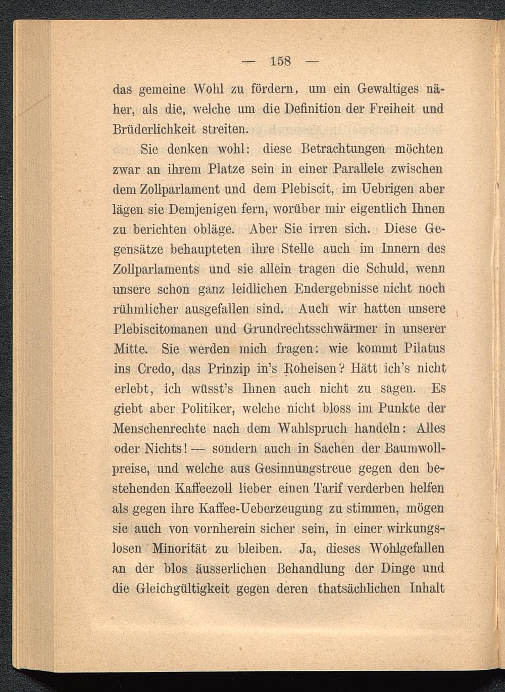 Sie denken wohl: diese Betrachtungen möchtenzwar an ihrem Platze sein in einer Parallele zwischendem Zollparlament und dem Plebiscit, im Uebrigen aberlägen sie Demjenigen fern, worüber mir eigentlich Ihnenzu berichten obläge. Aber Sie irren sich. Diese Ge-gensätze behaupteten ihre Stelle auch im Innern desZollparlaments und sie allein tragen die Schuld, wennunsere schon ganz leidlichen Endergebnisse nicht nochrühmlicher ausgefallen sind. Auch wir hatten unserePlebiscitomanen und Grundrechtsschwärmer in unsererMitte. Sie werden mich fragen: wie kommt Pilatusins Credo, das Prinzip in’s Roheisen? Hätt ich’s nichterlebt, ich wüsst’s Ihnen auch nicht zu sagen. Esgiebt aber Politiker, welche nicht bloss im Punkte derMenschenrechte nach dem Wahlspruch handeln: Allesoder Nichts! — sondern auch in Sachen der Baumwoll-preise, und welche aus Gesinnungstreue gegen den be-stehenden Kaffeezoll lieber einen Tarif verderben helfenals gegen ihre Kaffee-Ueberzeugung zu stimmen, mögensie auch von vornherein sicher sein, in einer wirkungs-losen Minorität zu bleiben. Ja, dieses Wohlgefallenan der blos äusserlichen Behandlung der Dinge unddie Gleichgültigkeit gegen deren thatsäclilicken Inhalt