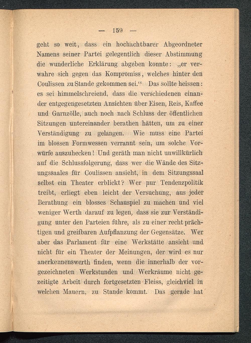 geht so weit, dass ein hochachtbarer AbgeordneterNamens seiner Partei gelegentlich dieser Abstimmungdie wunderliche Erklärung abgeben konnte: „er ver-wahre sich gegen das Kompromiss, welches hinter denCoulissen zu Stande gekommen sei.“ Das sollte heissen:es sei himmelschreiend, dass die verschiedenen einan-der entgegengesetzten Ansichten über Eisen, Reis, Kaffeeund Garnzölle, auch noch nach Schluss der öffentlichenSitzungen untereinander berathen hätten, um zu einerVerständigung zu gelangen. Wie muss eine Parteiim blossen Formwessen verrannt sein, um solche Vor-würfe auszuhecken! Und geräth man nicht unwillkürlichauf die Schlussfolgerung, dass wer die Wände des Sitz-ungssaales für Coulissen ansieht, in dem Sitzungssaalselbst ein Theater erblickt V Wer pur Tendenzpolitiktreibt, erliegt eben leicht der Versuchung, aus jederBerathung ein blosses Schauspiel zu machen und vielweniger Werth darauf zu legen, dass sie zur Verständi-gung unter den Parteien führe, als zu einer recht präch-tigen und greifbaren Aufpflanzung der Gegensätze. Weraber das Parlament für eine Werkstätte ansieht undnicht für ein Theater der Meinungen, der wird es nuranerkennenswerth finden, wenn die innerhalb der vor-gezeichneten Werkstunden und Werkräume nicht ge-zeitigte Arbeit durch fortgesetzten Fleiss, gleichviel inwelchen Mauern, zu Stande kommt. Das gerade hat