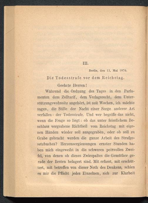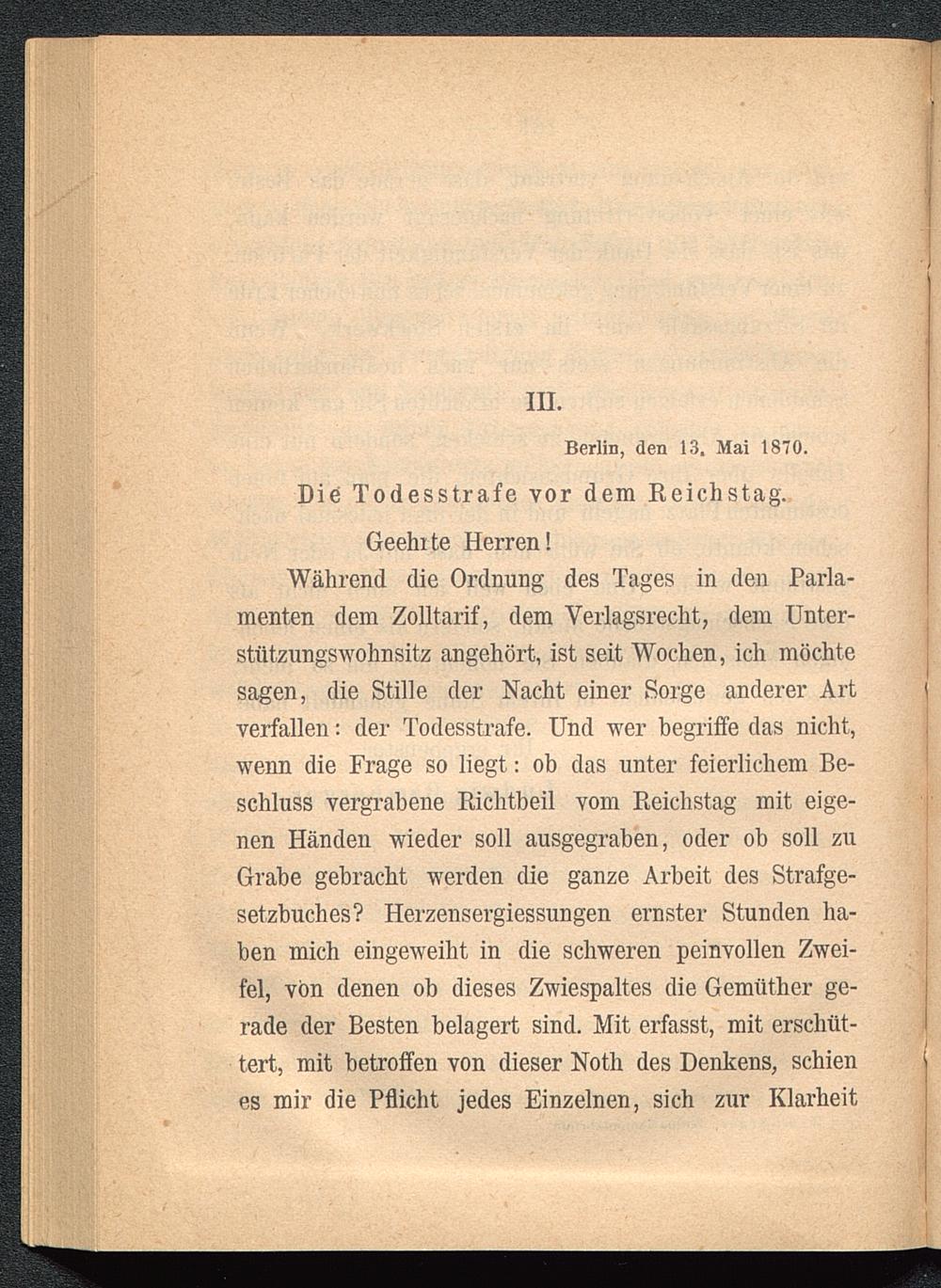 Während die Ordnung des Tages in den Parla-menten dem Zolltarif, dem Verlagsrecht, dem Unter-stützungswohnsitz angehört, ist seit Wochen, ich möchtesagen, die Stille der Nacht einer Sorge anderer Artverfallen: der Todesstrafe. Und wer begriffe das nicht,wenn die Frage so liegt: ob das unter feierlichem Be-schluss vergrabene Richtbeil vom Reichstag mit eige-nen Händen wieder soll ausgegraben, oder ob soll zuGrabe gebracht werden die ganze Arbeit des Strafge-setzbuches? Herzensergiessungen ernster Stunden ha-ben mich eingeweiht in die schweren peinvollen Zwei-fel, von denen ob dieses Zwiespaltes die Gemüther ge-rade der Besten belagert sind. Mit erfasst, mit erschüt-tert, mit betroffen von dieser Noth des Denkens, schienes mir die Pflicht jedes Einzelnen, sich zur Klarheit