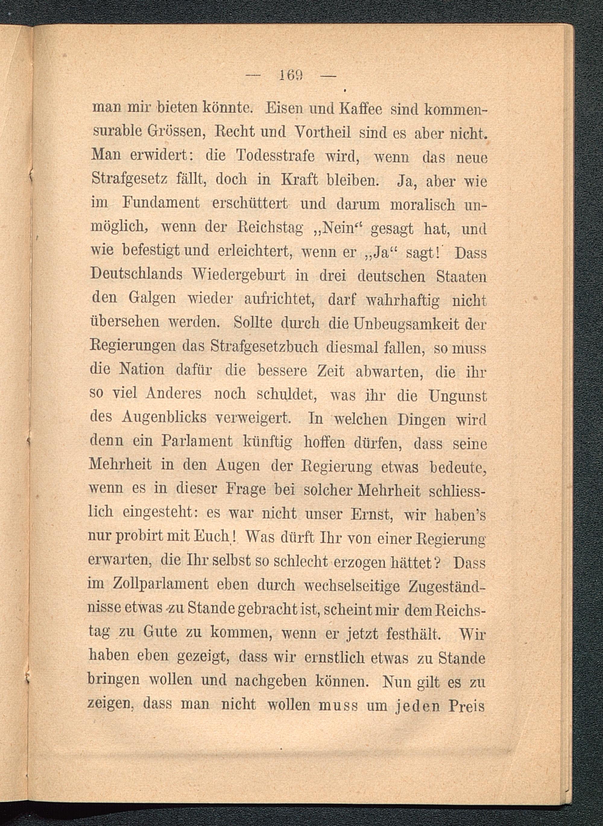 man mir bieten könnte. Eisen und Kaffee sind kommen-surable Grössen, Recht und Vortheil sind es aber nicht.Man erwidert: die Todesstrafe wird, wenn das neueStrafgesetz fällt, doch in Kraft bleiben. Ja, aber wieim Fundament erschüttert und darum moralisch un-möglich, wenn der Reichstag „Nein“ gesagt hat, undwie befestigt und erleichtert, wenn er „Ja“ sagt! DassDeutschlands AViedergeburt in drei deutschen Staatenden Galgen wieder aufrichtet, darf wahrhaftig nichtübersehen werden. Sollte durch die Unbeugsamkeit derRegierungen das Strafgesetzbuch diesmal fallen, so mussdie Nation dafür die bessere Zeit abwarten, die ihrso viel Anderes noch schuldet, was ihr die Ungunstdes Augenblicks verweigert. In welchen Dingen wirddenn ein Parlament künftig hoffen dürfen, dass seineMehrheit in den Augen der Regierung etwas bedeute,wenn es in dieser Frage bei solcher Mehrheit schliess-lich eingestellt: es war nicht unser Ernst, wir haben’snur probirt mit Euch! AVas dürft Ihr von einer Regierungerwarten, die Ihr selbst so schlecht erzogen hättet? Dassim Zollparlament eben durch wechselseitige Zugeständ-nisse etwas -zu Stande gebracht ist, scheint mir dem Reichs-tag zu Gute zu kommen, wenn er jetzt festhält, AVirhaben eben gezeigt, dass wir ernstlich etwas zu Standebringen wollen und nachgeben können. Nun gilt es zuzeigen, dass man nicht wollen muss um jeden Preis