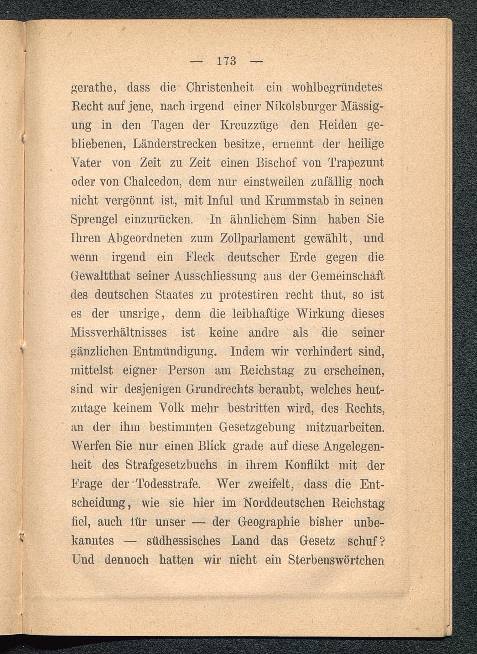 gerathe, dass die Christenheit ein wohlbegründetesRecht auf jene, nach irgend einer Nikolsburger Mässig-ung in den Tagen der Kreuzzüge den Heiden ge-bliebenen, Länderstrecken besitze, ernennt der heiligeVater von Zeit zu Zeit einen Bischof von Trapezuntoder von Chalcedon , dem nur einstweilen zufällig nochnicht vergönnt ist, mit Inful und Krummstab in seinenSprengel einzurücken. In ähnlichem Sinn haben SieIhren Abgeordneten zum Zollparlament gewählt, undwenn irgend ein Fleck deutscher Erde gegen dieGewaltthat seiner Ausschliessung aus der Gemeinschaftdes deutschen Staates zu protestiren recht tliut, so istes der unsrige, denn die leibhaftige Wirkung diesesMissverhältnisses ist keine andre als die seinergänzlichen Entmündigung. Indem wir verhindert sind,mittelst eigner Person am Reichstag zu erscheinen,sind wir desjenigen Grundrechts beraubt, welches heut-zutage keinem Volk mehr bestritten wird, des Rechts,an der ihm bestimmten Gesetzgebung mitzuarbeiten.Werfen Sie nur einen Blick grade auf diese Angelegen-heit des Sti’afgesetzbuchs in ihrem Konflikt mit derFrage der Todesstrafe. Wer zweifelt, dass die Ent-scheidung, wie sie hier im Norddeutschen Reichstagfiel, auch iür unser — der Geographie bisher unbe-kanntes — südhessisches Land das Gesetz schuf?Und dennoch hatten wir nicht ein Sterbenswörtchen
