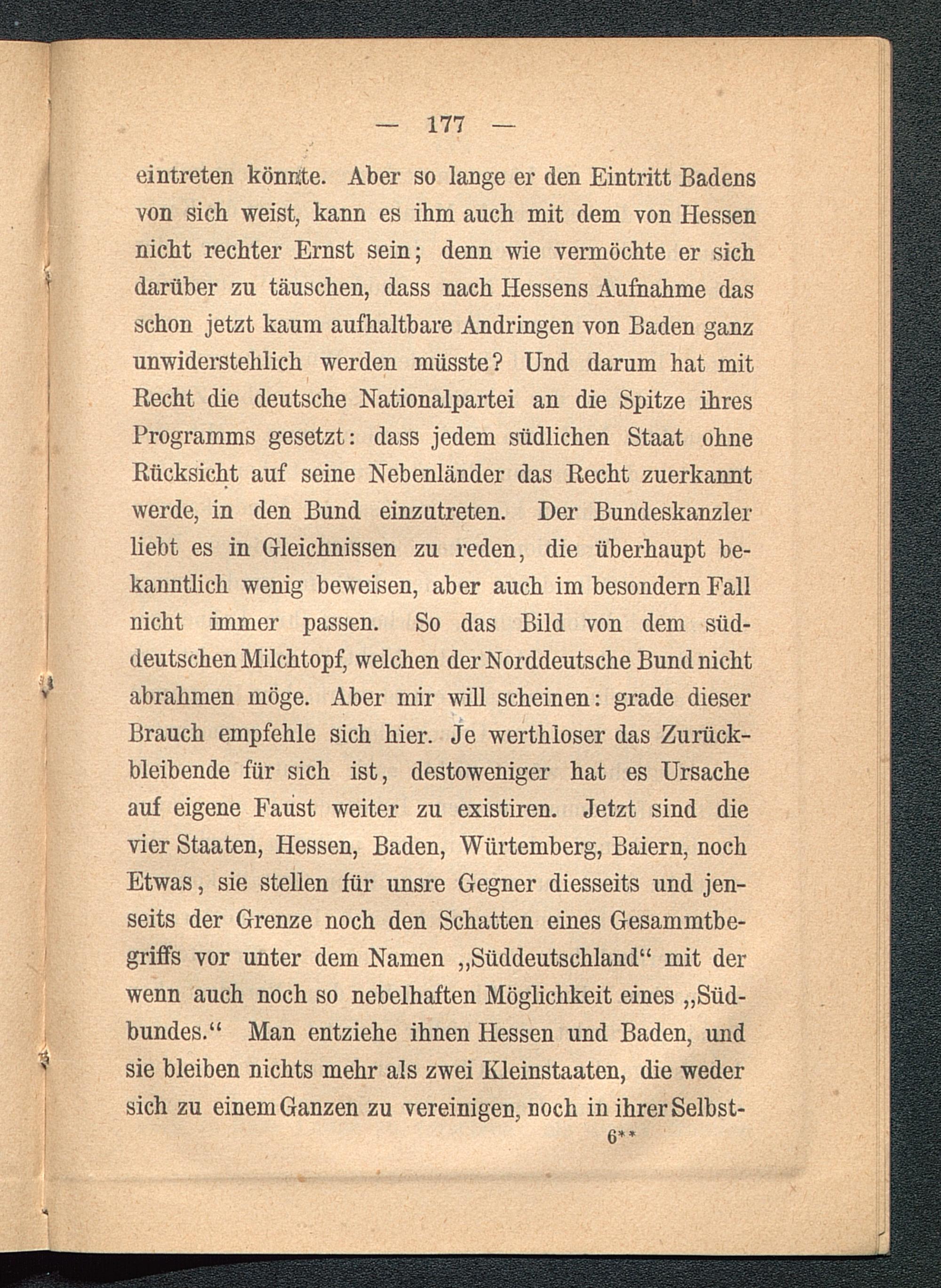 eintreten könnte. Aber so lange er den Eintritt Badensvon sich weist, kann es ihm auch mit dem von Hessen nicht rechter Ernst sein; denn wie vermöchte er sichdarüber zu täuschen, dass nach Hessens Aufnahme dasschon jetzt kaum aufhaltbare Andringen von Baden ganzunwiderstehlich werden müsste? Und darum hat mitRecht die deutsche Nationalpartei an die Spitze ihresProgramms gesetzt: dass jedem südlichen Staat ohneRücksicht auf seine Nebenländer das Recht zuerkanntwerde, in den Bund einzutreten. Der Bundeskanzlerliebt es in Gleichnissen zu reden, die überhaupt be-kanntlich wenig beweisen, aber auch im besondern Fallnicht immer passen. So das Bild von dem süd-deutschen Milchtopf, welchen der Norddeutsche Bund nichtabrahmen möge. Aber mir will scheinen: grade dieserBrauch empfehle sich hier. Je werthioser das Zurück-bleibende für sich ist, destoweniger hat es Ursacheauf eigene Faust weiter zu existiren. Jetzt sind dievier Staaten, Hessen, Baden , Würtemberg, Baiern, nochEtwas, sie stellen für unsre Gegner diesseits und jen-seits der Grenze noch den Schatten eines Gesammtbe-griffs vor unter dem Namen „Süddeutschland “ mit derwenn auch noch so nebelhaften Möglichkeit eines „Süd-bundes.“ Man entziehe ihnen Hessen und Baden, undsie bleiben nichts mehr als zwei Kleinstaaten, die weder