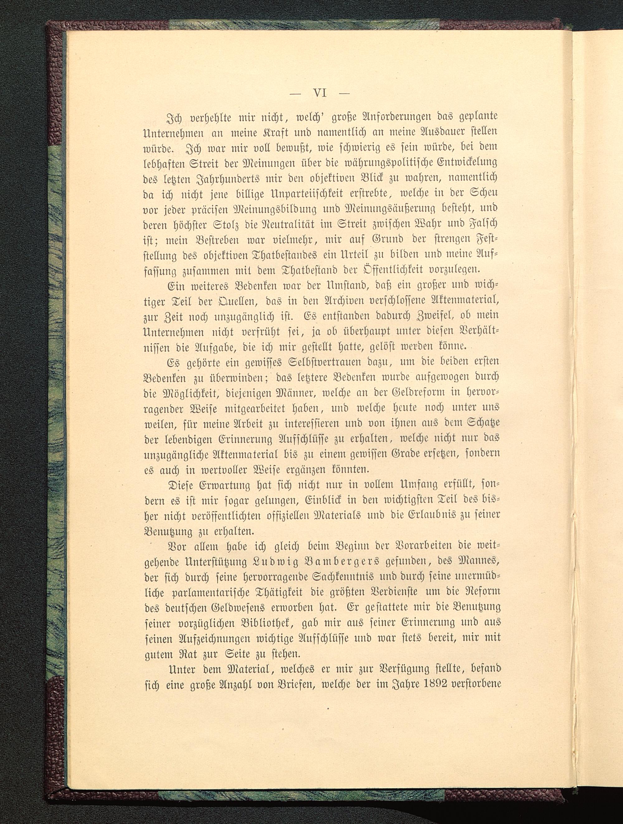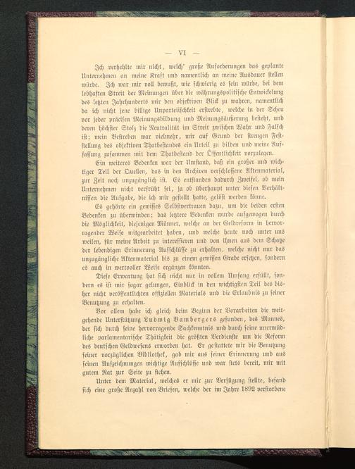 Vor allem habe ich gleich beim Beginn der Vorarbeiten die weit-gehende Unterstützung Ludwig Bambergers gesunden, des Mannes,der sich durch seine hervorragende Sachkenntnis und dnrch seine unermüd-liche parlamentarische Thätigkeit die größten Verdienste um die Reformdes deutschen Geldwesens erworben hat. Er gestattete mir die Benntzungseiner vorzüglichen Bibliothek, gab niir aus seiner Erinnerung und ausseinen Aufzeichnungen wichtige Aufschlüsse uud war stets bereit, mir mitgutem Rat zur Seite zu stehe».