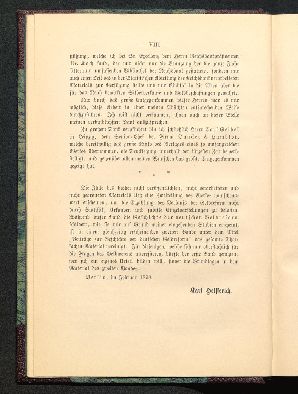 Zu großem Dank verpflichtet bin ich schließlich Herrn Carl Geibel in Leipzig, dem Senior-Ches der Firma Duncker Humblot ,welche bereitwillig das große Risiko des Verlages eines so umfangreichenWerkes übernommen, die Drucklegung innerhalb der kürzesten Zeit bewerk-stelligt, und gegenüber allen meinen Wünschen das größte Entgegenkommengezeigt hat,