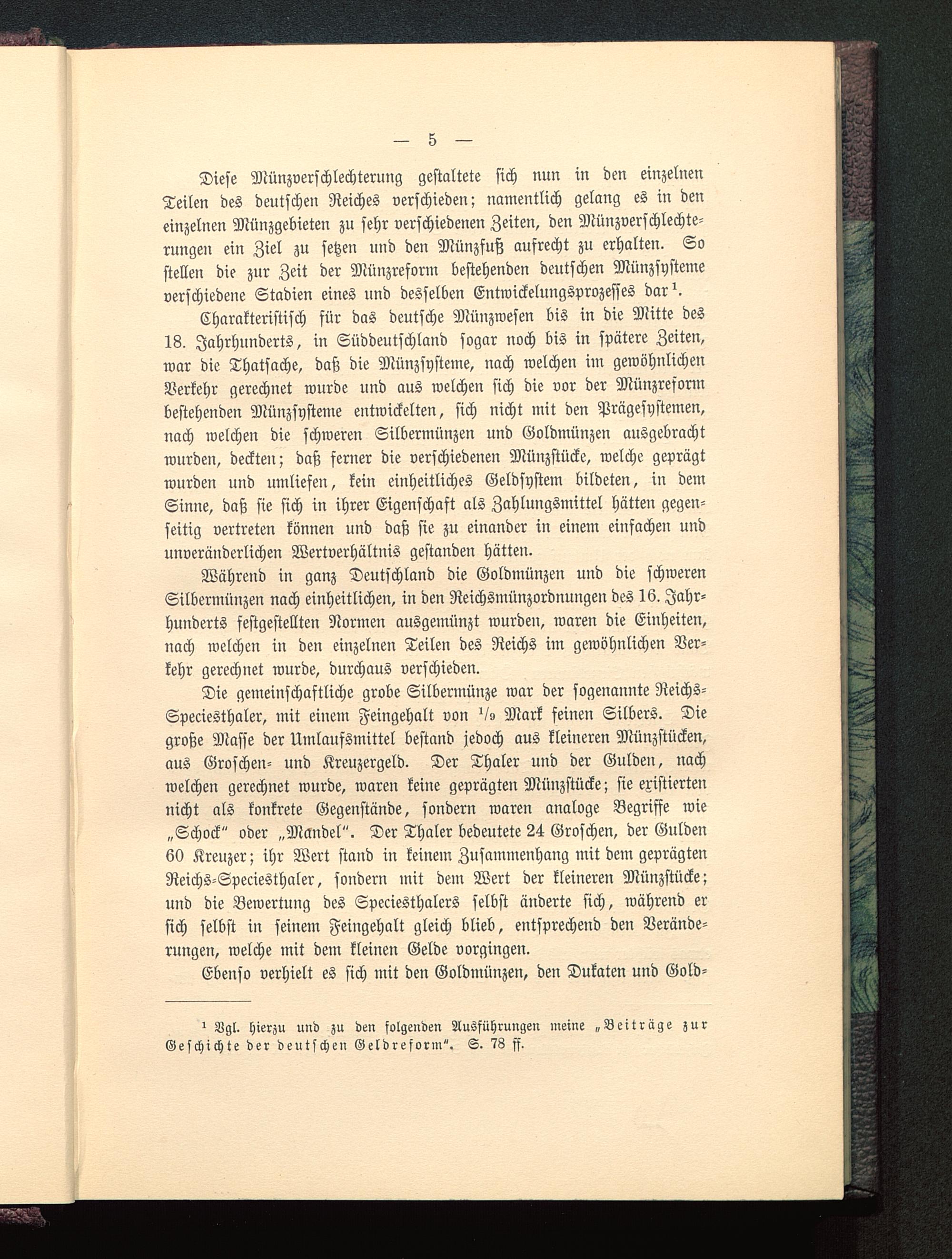 Charakteristisch für das deutsche Münzwesen bis in die Mitte des18. Jahrhunderts, in Süddeutschland sogar noch bis in spätere Zeiten,war die Thatsache, daß die Münzsysteme, nach welchen im gewöhnlichenVerkehr gerechnet wurde und aus welchen sich die vor der Münzreformbestehenden Mttnzsysteme entwickelten, sich nicht mit den Prägesystemen,nach welchen die schweren Silbermünzen und Goldmünzen ausgebrachtwurdeu, deckten; daß ferner die verschiedenen Münzstücke, welche geprägtwurden und umliefen, kein einheitliches Geldsystem bildeten, in demSinne, daß sie sich in ihrer Eigenschaft als Zahlungsmittel hätten gegen-seitig vertreten können und daß sie zu einander in einem einfachen undunveränderlichen Wertverhältnis gestanden hätten.