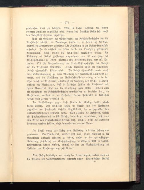 Im April wurde das Gesetz vom Reichstag in dritter Lesung an-genommen. Der Bundesrat, welcher froh war, seinen Entwurf in derHauptsache aufrecht erhalten zu sehen, nahm an der geringfügigenÄnderung hinsichtlich der Vorschußleistung in Bargeld statt in Reichs-kassenscheinen keinen Anstoß, zumal die Art der Vorschußleistnng insBelieben der Reichsregierung gestellt war.