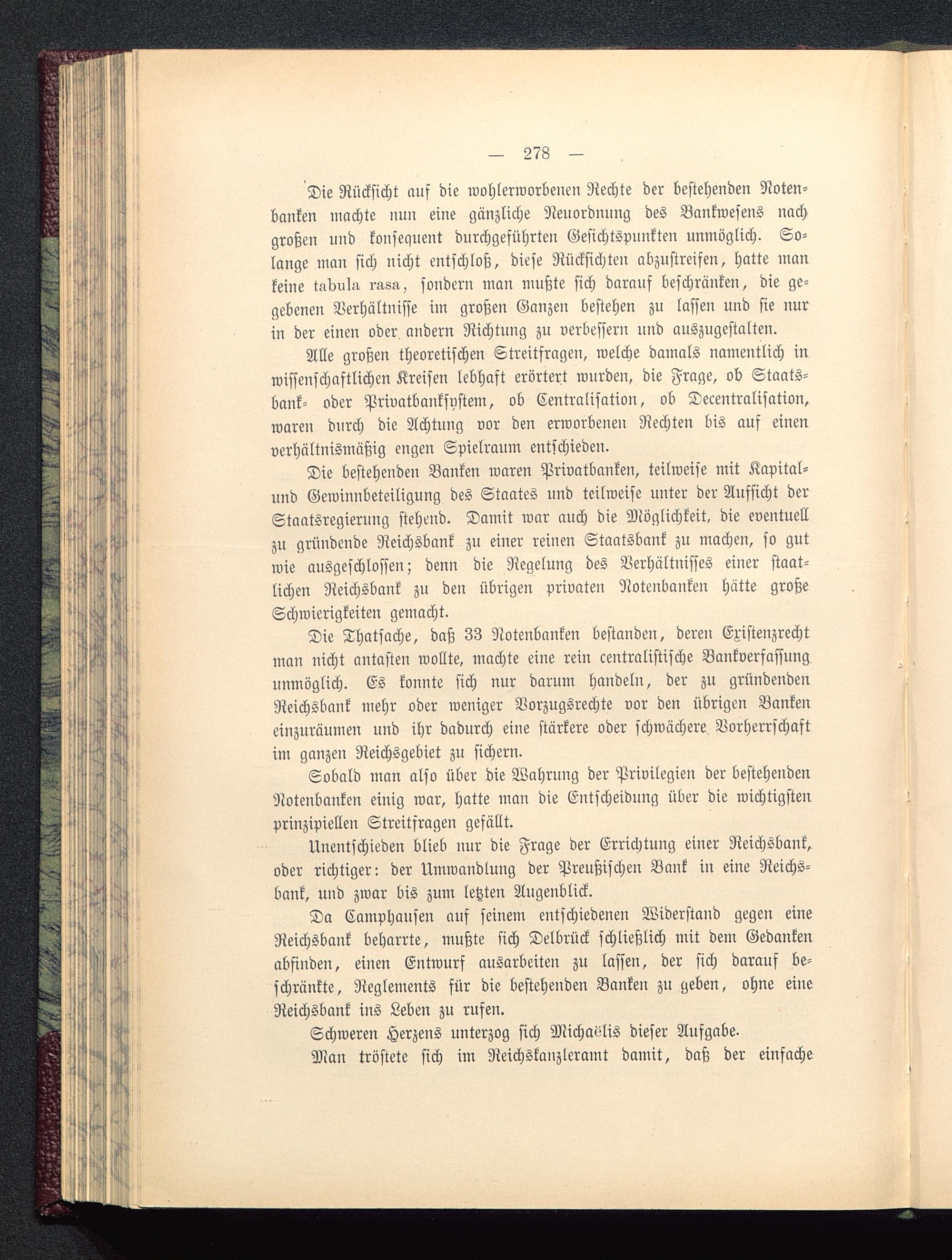 Die Thatsache, daß 33 Notenbanken bestanden, deren Existenzrechtman nicht antasten wollte, machte eine rein centralistische Bankverfassunguumöglich. Es konnte sich nur darum haudelu, der zu gründendenReichsbank mehr oder weniger Vorzugsrechte vor den übrigen Bankeneinzuräumen und ihr dadurch eine stärkere oder schwächere Vorherrschaftim ganzen Reichsgebiet zu sichern.