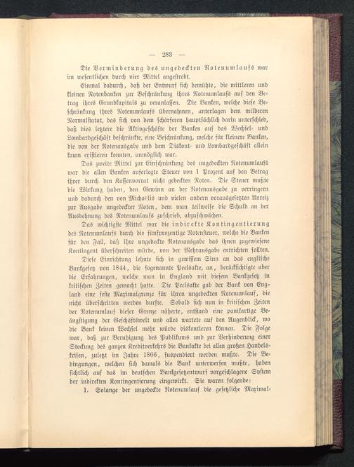 Das wichtigste Mittel war die indirekte Kontingentierungdes Notenumlaufs durch die fünfprozentige Notensteuer, welche die Bankenfür den Fall, daß ihre ungedeckte Notenausgabe das ihnen zugewieseneKontingent überschreiten würde, von der Mehrausgabe entrichten sollten.
