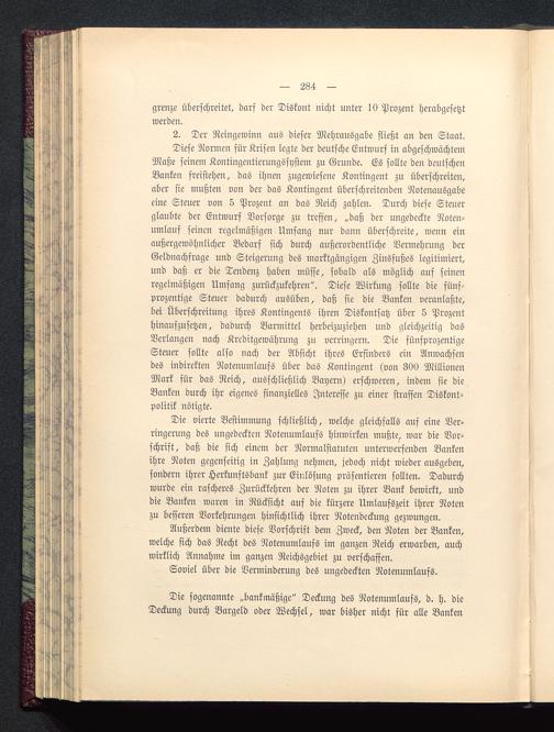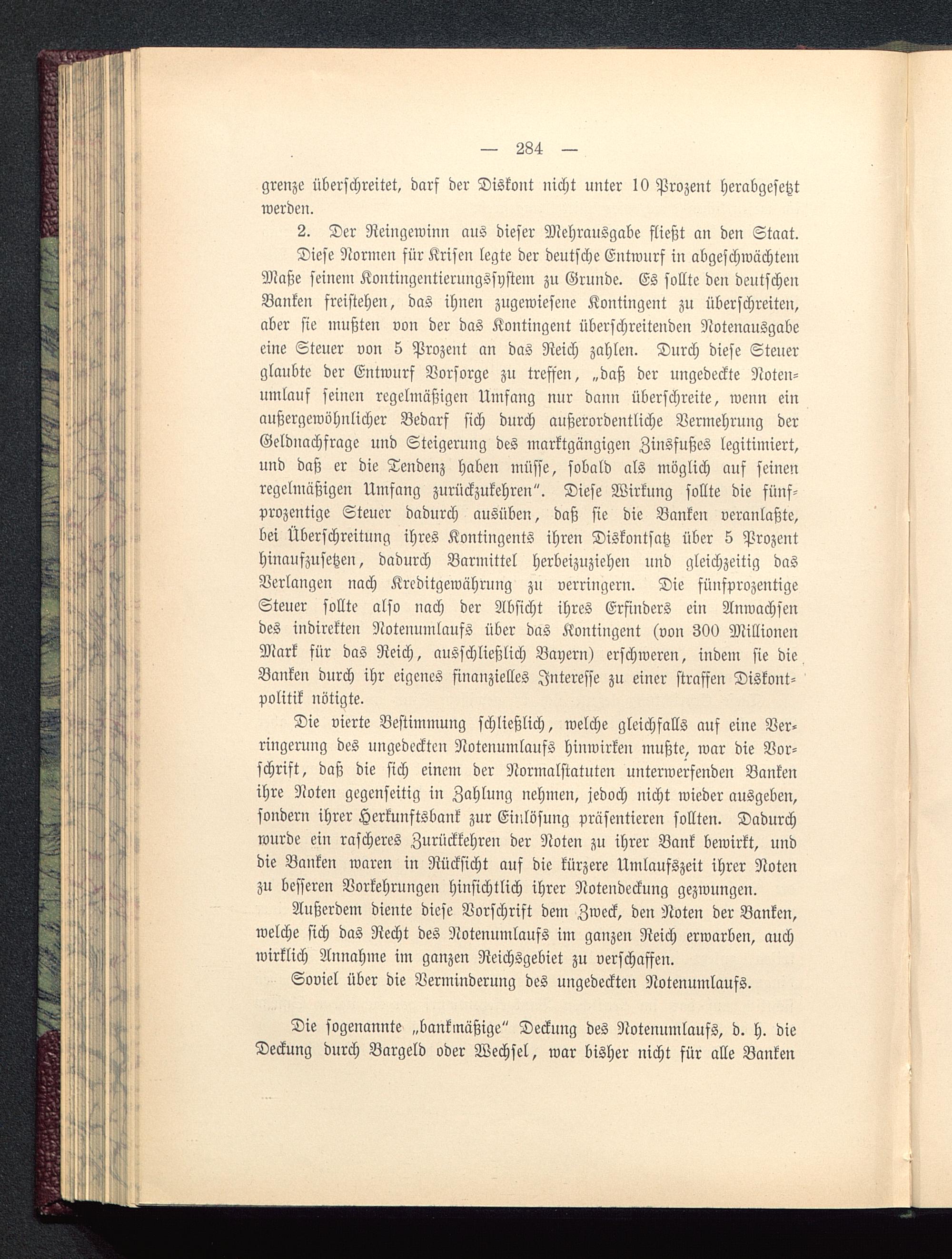 Diese Normen für Krisen legte der deutsche Entwurf in abgeschwächtemMaße seinem Kontingentierungssystem zu Grunde. Es sollte den deutschenBanken freistehen, das ihnen zugewiesene Kontingent zu überschreiten,aber sie mußten von der das Kontingent überschreitenden Notenausgabeeine Steuer von 5 Prozent an das Reich zahlen. Durch diese Steuerglaubte der Entwurf Vorsorge zu treffen, „daß der ungedeckte Noten-umlauf seinen regelmäßigen Umfang nur dann überschreite, wenn einaußergewöhnlicher Bedarf sich durch außerordentliche Vermehrung derGeldnachfrage und Steigerung des marktgängigen Zinsfußes legitimiert,und daß er die Tendenz haben müsse, sobald als möglich auf seinenregelmäßigen Umfang zurückzukehren". Diese Wirkung sollte die fünf-prozentige Steuer dadurch ausüben, daß sie die Banken veranlaßte,bei Überschreitung ihres Kontingents ihren Diskontsatz über 5 Prozenthinaufzusetzen, dadurch Barmittel herbeizuziehen und gleichzeitig dasVerlangen nach Kreditgewährung zu verringern. Die fünfprozentigeSteuer sollte also nach der Absicht ihres Erfinders ein Anwachsendes indirekten Notenumlaufs über das Kontingent (von 300 MillionenMark für das Reich, ausschließlich Bayern ) erschweren, indem sie die,Banken durch ihr eigenes finanzielles Interesse zu einer straffen Diskont-politik nötigte.