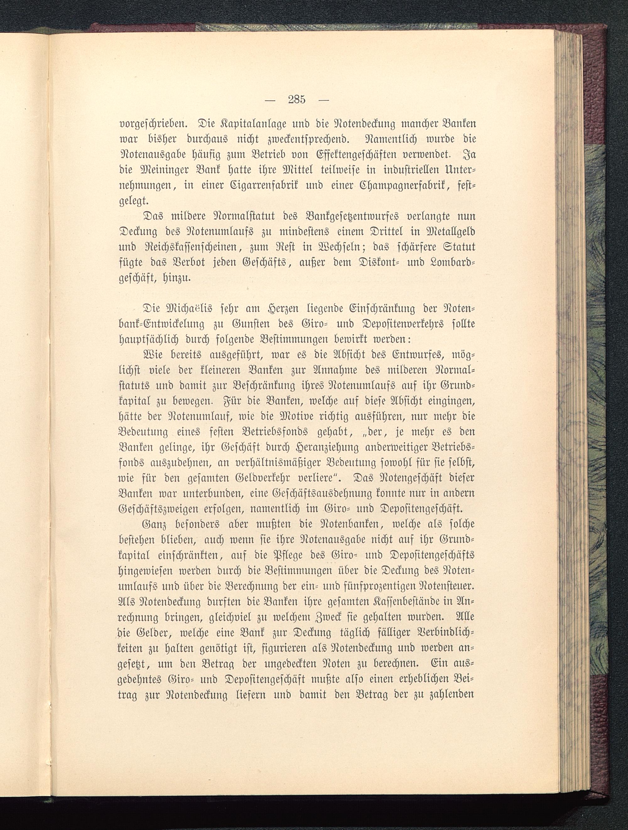Das mildere Normalstatut des Bankgesetzentwurfes verlangte nunDeckung des Notenumlaufs zu mindestens einem Drittel in Metallgeldund Reichskassenscheinen, zum Rest in Wechseln; das schärfere Statutfügte das Verbot jeden Geschäfts, außer dem Diskont- und Lombard-geschäft, hinzu.