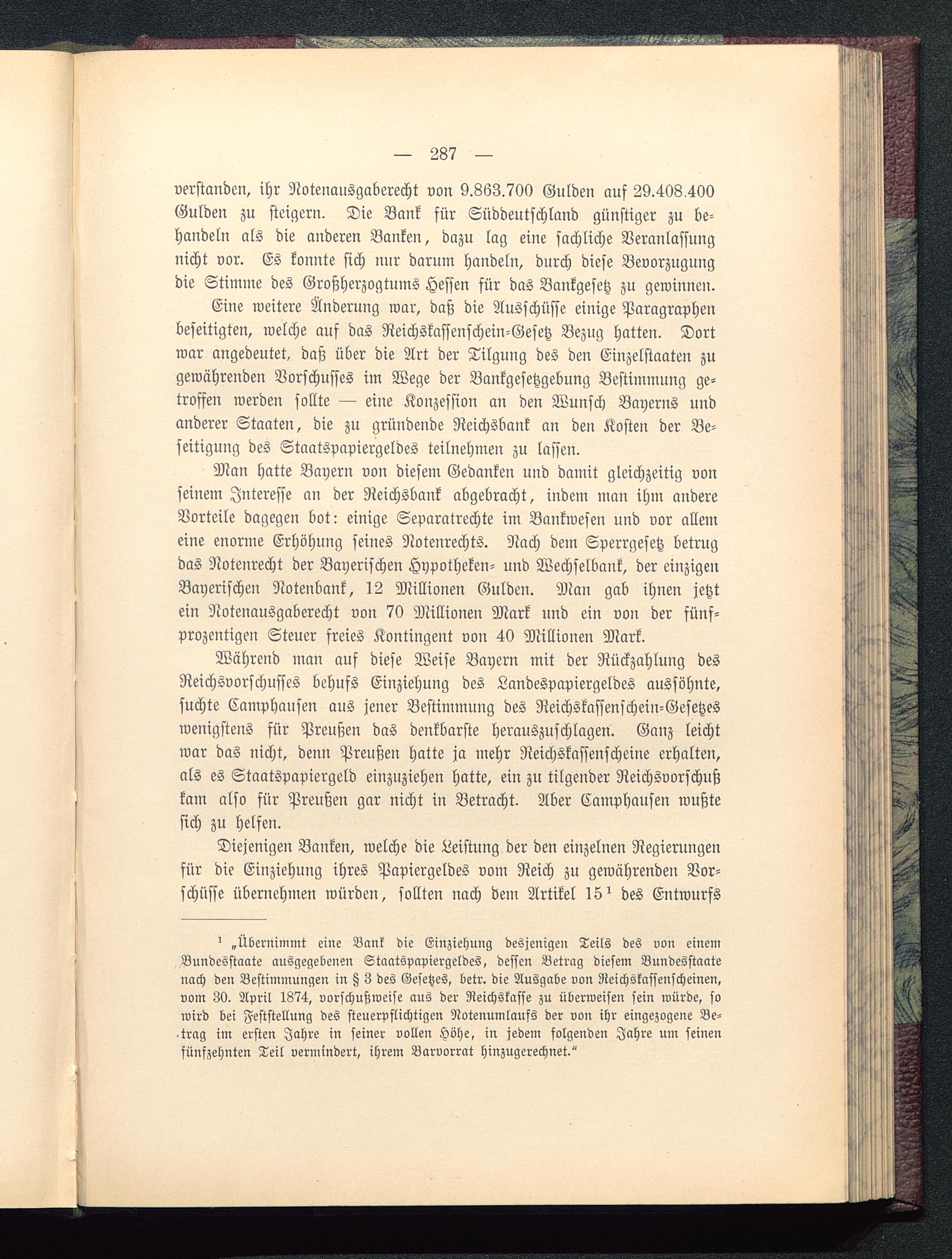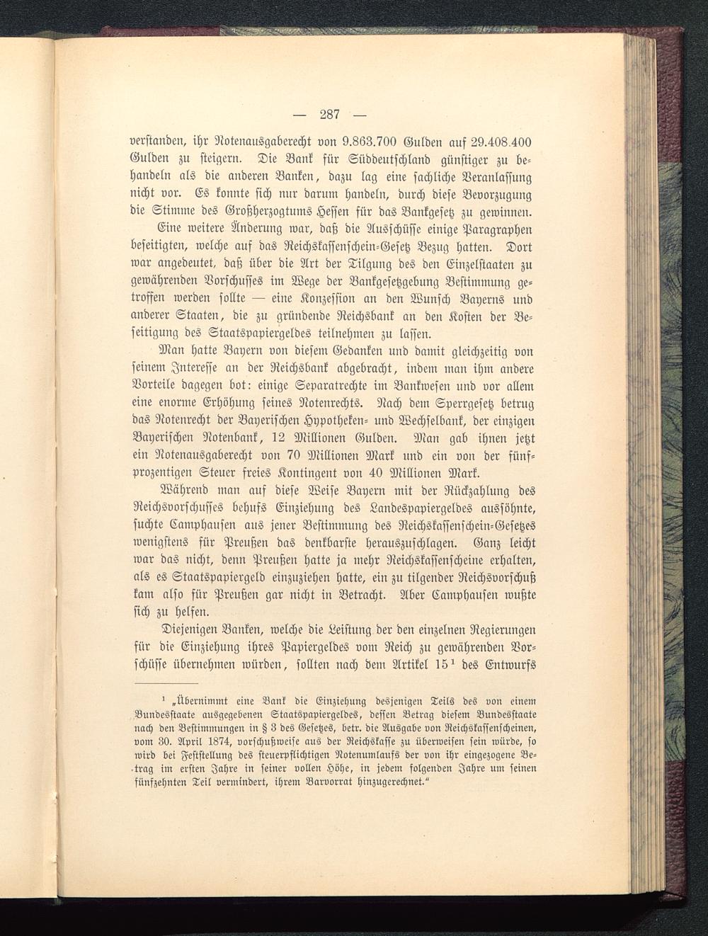 Man hatte Bayern von diesem Gedanken und damit gleichzeitig vonseinem Interesse an der Reichsbank abgebracht, indem man ihm andereVorteile dagegen bot: einige Separatrechte im Bankwesen und vor allemeine enorme Erhöhung seines Notenrechts. Nach dem Sperrgesetz betrugdas Notenrecht der Bayerischen Hypotheken- und Wechselbank, der einzigenBayerischen Notenbank, 12 Millionen Gulden. Man gab ihnen jetztein Notenausgaberecht von 70 Millionen Mark und ein von der fünf-prozentigen Steuer freies Kontingent von 40 Millionen Mark.