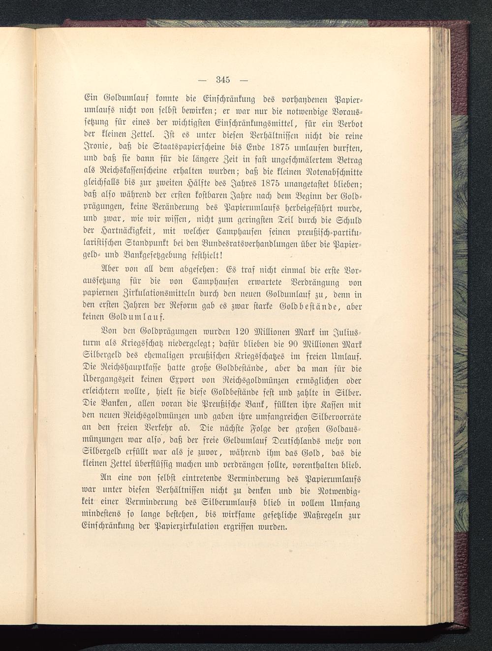 Ein Golduinlauf konnte die Einschränkung des vorhandenen Papier -umlanfs nicht von selbst bewirken; er war nur die notwendige Voraus-setzung für eines der wichtigsten Einschränkungsmittel, für ein Verbotder kleinen Zettel. Ist es unter diesen Verhältnissen nicht die reineIronie, daß die Staatspapierscheine bis Ende 1875 umlaufen durften,und daß sie dann für die längere Zeit in fast ungeschmälertem Betragals Reichskassenscheine erhalten wurden; daß die kleinen Notenabschnittegleichfalls bis zur zweiten Hälfte des Jahres 1875 unangetastet blieben;daß also während der ersten kostbaren Jahre nach dem Beginn der Gold-prägungen, keine Veränderung des Papierumlaufs herbeigeführt wurde,und zwar, wie wir wissen, nicht zum geringsten Teil durch die Schuldder Hartnäckigkeit, mit welcher Camphausen seinen preußisch-partiku-laristischen Staudpunkt bei den Buudesratsverhandluugen über die Papier-geld- und Bankgesetzgebung festhielt!