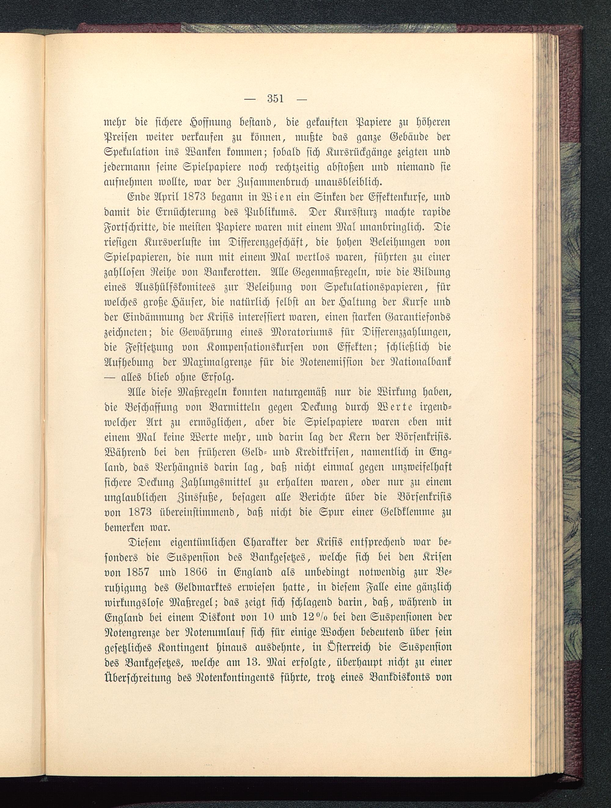 Ende April 1873 begann in Wien ein Sinken der Effektenkurse, unddamit die Ernüchterung des Publikums. Der Kurssturz machte rapideFortschritte, die meisten Papiere waren mit einem Mal unanbringlich. Dieriesigen Kursverluste im Differenzgeschäft, die hohen Beleihungen vonSpielpapieren, die nun mit einem Mal wertlos waren, führten zu einerzahllosen Reihe von Bankerotten. Alle Gegenmaßregeln, wie die Bildungeines Aushülfskomitees zur Beleihung von Spekulationspapieren, fürwelches große Häuser, die natürlich selbst an der Haltung der Kurse undder Eindämmung der Krisis interessiert waren, einen starken Garantiefondszeichneten; die Gewähruug eines Moratoriums für Differenzzahluugeu,die Festsetzung von Kompensationskursen von Effekten; schließlich dieAufhebung der Maximalgrenze für die Notenemission der Nationalbank— alles blieb ohne Erfolg.