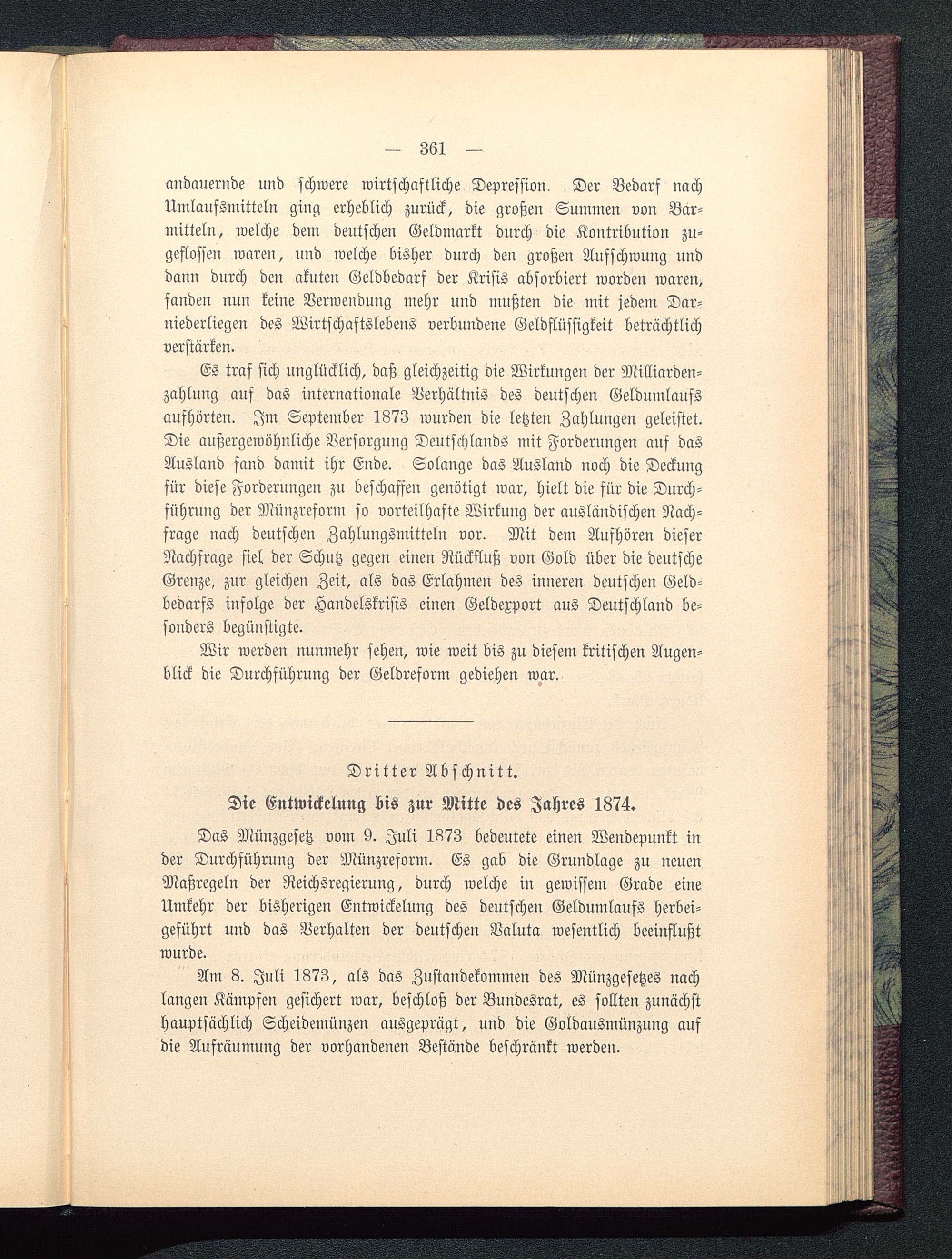Das Münzgesetz vom 9. Juli 1873 bedeutete einen Wendepunkt inder Durchführung der Münzreform. Es gab die Grundlage zu neuenMaßregeln der Reichsregierung, durch welche in gewissem Grade eineUmkehr der bisherigen Entwickeluug des deutschen Geldumlaufs herbei-geführt und das Verhalten der deutschen Valuta wesentlich beeinflußtwurde.