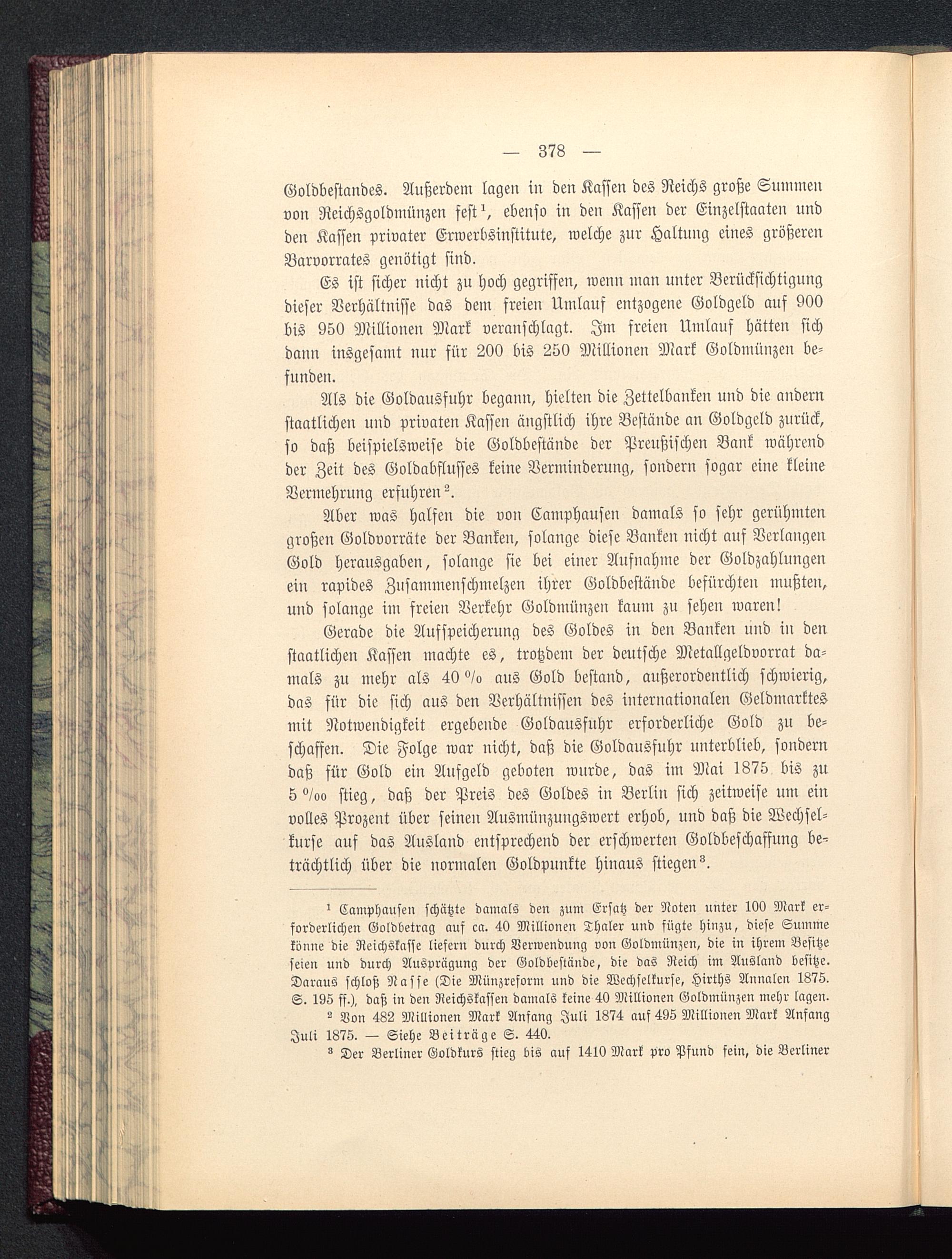 ' Camphausen schätzte damals den zum Ersatz der Noten unter 100 Mark er-forderlichen Goldbetrag auf ca. 4V Millionen Thaler und fügte hinzu, diese Summekönne die Reichskasse liefern durch Verwendung von Goldmünzen, die in ihrem Besitzeseien und durch Ausprägung der Goldbestände, die das Reich im Ausland besitze.Daraus schloß Nasse Me Münzreform und die Wechselkurse, Hirths Annalen 187S.S. 195 ff.), daß in den Neichskassen damals keine 4l) Millionen Goldmünzen mehr lagen.