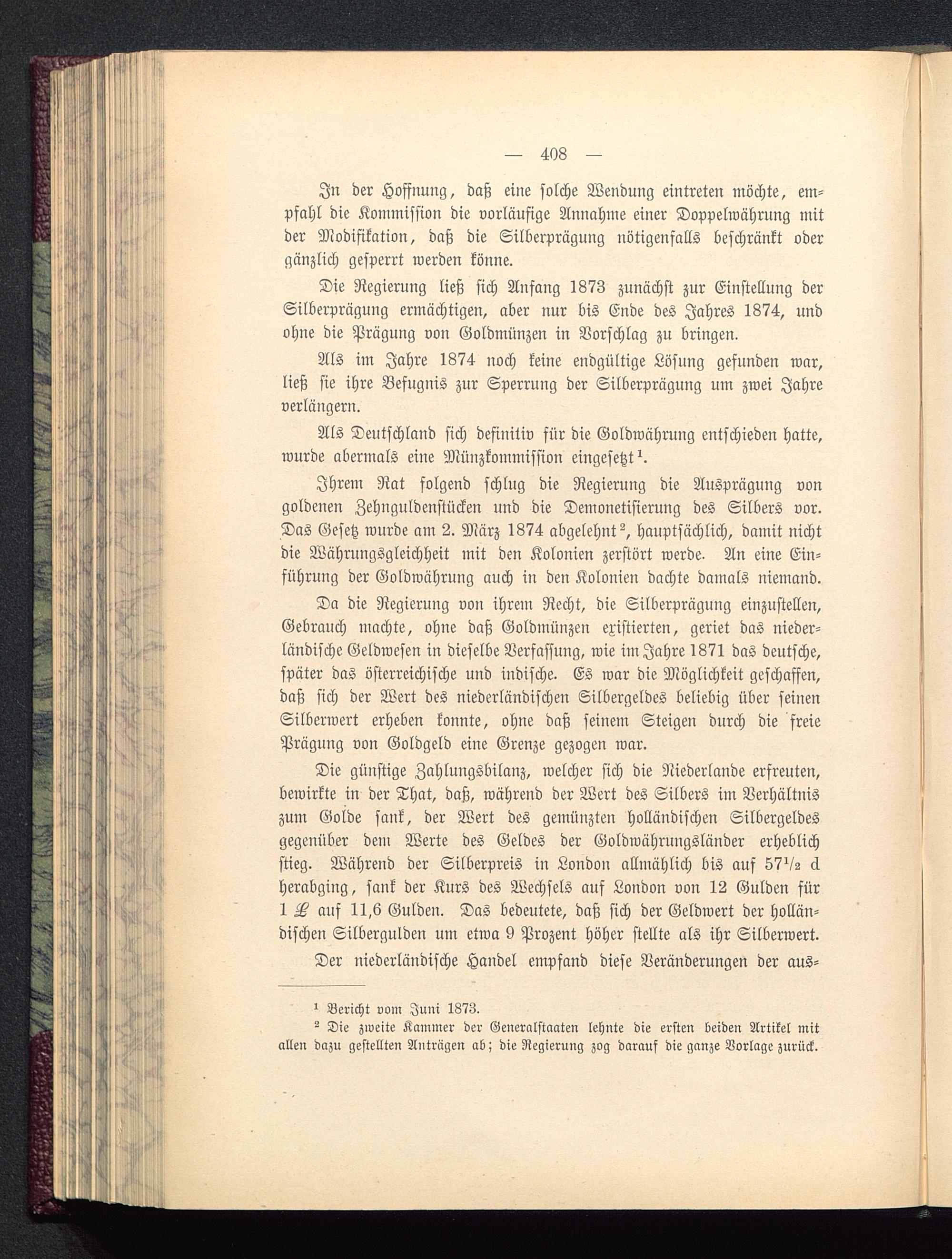 Die Regierung ließ sich Anfang 1873 zunächst zur Einstellung derSilberprägung ermächtigen, aber nur bis Ende des Jahres 1874, undohne die Prägung von Goldmünzen in Vorschlag zu briugen.