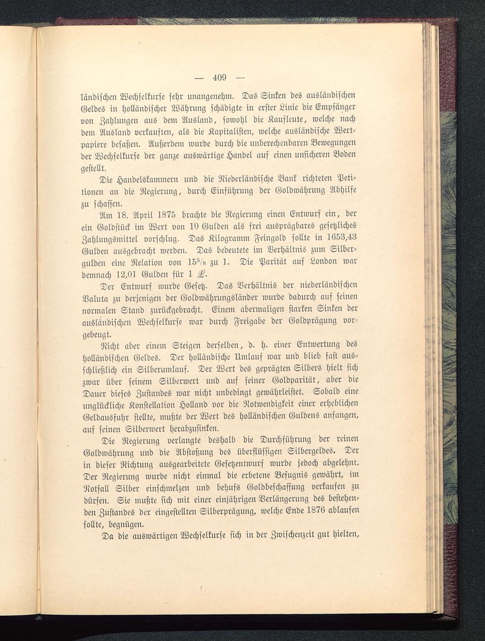Am 18. April 1875 brachte die Regierung einen Entwurf ein, derein Goldstück im Wert von 10 Gulden als frei ausprägbares gesetzlichesZahlungsmittel vorschlug. Das Kilogramm Feingold sollte in 1653,43Gulden ausgebracht werdeu. Das bedeutete im Verhältnis zum Silber-gulden eine Relation von 15^/8 zu 1. Die Parität auf London wardemnach 12,01 Gulden für 1 F.