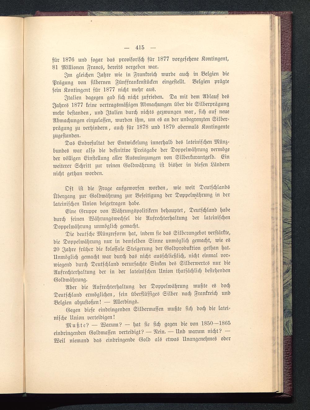 Eine Gruppe von Währuugspolitikern behauptet, Deutschland habedurch seinen Währungswechsel die Aufrechterhaltung der lateinischenDoppelwährung unmöglich gemacht.
