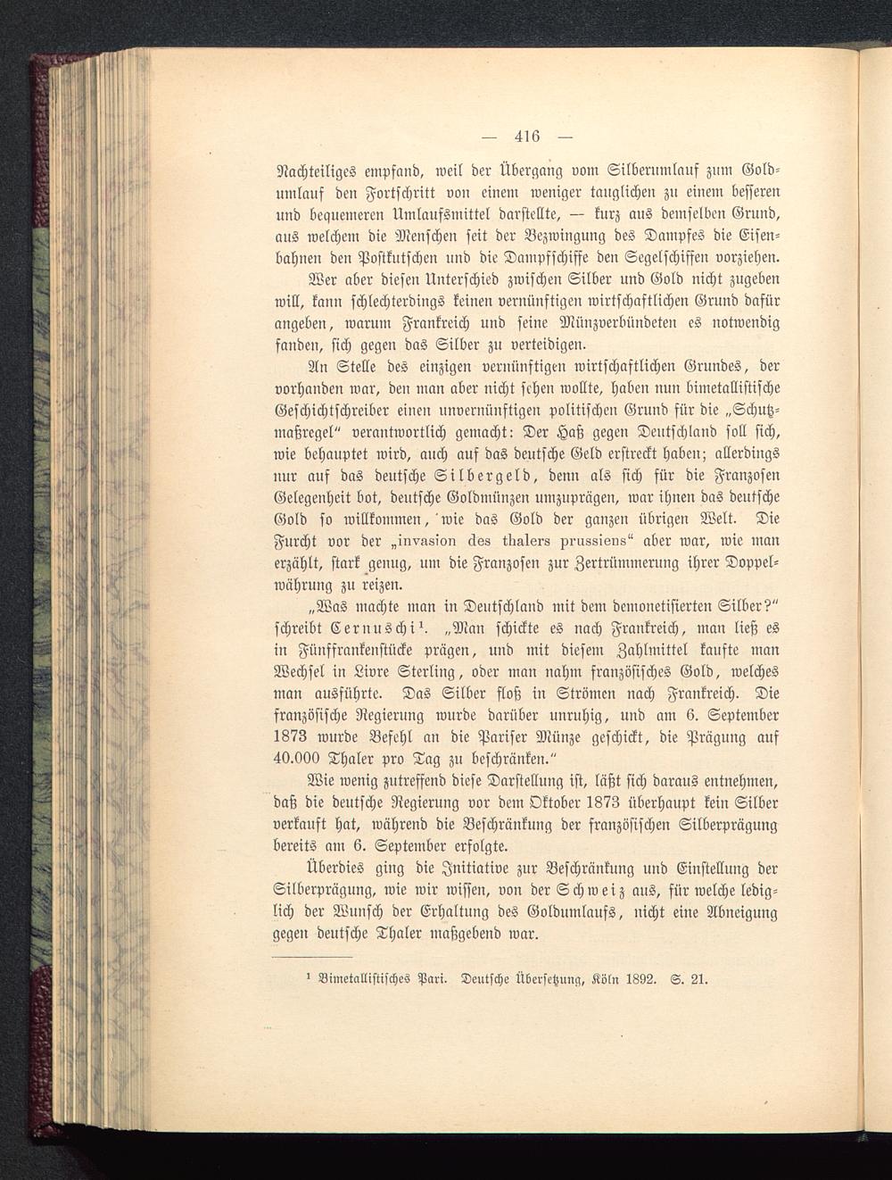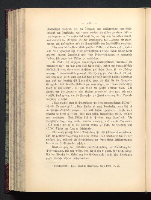 Überdies ging die Initiative zur Beschränkung und Einstellung derSilberprägung, wie wir wissen, von der Schweiz aus, für welche ledig-lich der Wunsch der Erhaltung des Goldumlaufs, uicht eine Abneigunggegen deutsche Thaler maßgebend war.