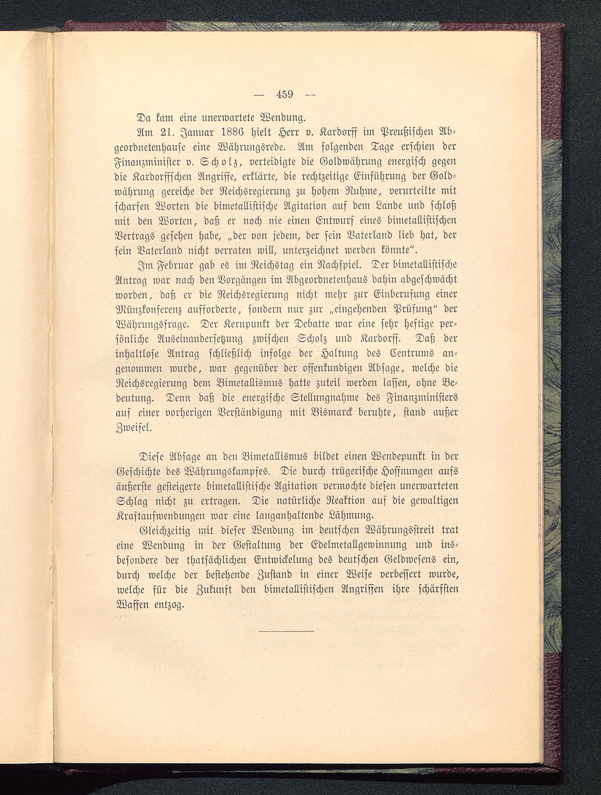 Am 21. Januar 1886 hielt Herr v. Kardorff im Preußischen Ab-geordnetenhause eine Währungsrede. Am folgenden Tage erschien derFinanzminister v. Scholz, verteidigte die Goldwährung energisch gegendie Kardorffschen Angriffe, erklärte, die rechtzeitige Einführung der Gold-währung gereiche der Neichsregierung zu hohem Ruhme, verurteilte mitscharfen Worten die bimetallistische Agitation auf dem Lande und schloßmit den Worten, daß er noch nie einen Entwurf eines bimetallistischenVertrags gesehen habe, „der von jedem, der sein Vaterland lieb hat, dersein Vaterland nicht verraten will, unterzeichnet werden könnte".