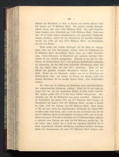 Vor allem hat die Stellung der Reichsbank durch diese Entwickelungeine außerordentliche Kräftigung erfahren. Wohl hat sie nur einen ge-ringen Teil des von ihr angekauften Goldes in ihren Kassen behalten.Der weitaus größte Teil ist in den freien Umlauf übergegangen. Aberimmerhin hat sich ihr Goldvorrat ganz enorm vergrößert. Während erim Durchschnitt des Jahres 1881 nur 207 Millionen Mark betrug, imDurchschnitt des Jahres 1885 277 Millionen Mark, erreichte er bereitsim Jahre 1888 den Umfang von 608 Millionen Mark. Zwar konnteer sich auf dieser durch den ungewöhnlichen Goldzufluß des Jahres 1888erreichten Höhe nicht halten, aber er sank von nun ab niemals tiefer als bisauf 519 Millionen Mark (im Durchschnitt des Jahres 1390), und im Durch-schnitt des Jahres 1895 stellte er sich höher als 700 Millionen Mark, währender zeitweise einen Umfang von mehr als 800 Millionen erreicht hat. Inden beiden letzten Jahren hat er durch das gesteigerte Bedürfnis des ineinem ungewöhnlich lebhaften Aufschwung begriffenen Verkehrs allerdingswieder eine Verminderung auf etwa 600 Millionen Mark erfahren, aber