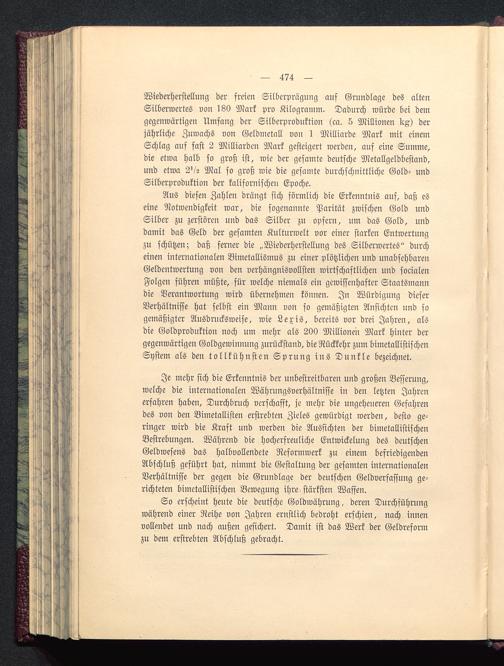 Wiederherstellung der freien Silberprägung auf Grundlage des altenSilberwertes von 180 Mark pro Kilogramm. Dadurch würde bei demgegenwärtigen Umfang der Silberproduktion (ca. 5 Millionen derjährliche Zuwachs von Geldmetall von l Milliarde Mark mit einemSchlag auf fast 2 Milliarden Mark gesteigert werden, auf eine Snmme,die etwa halb so groß ist, wie der gesamte deutsche Metallgeldbestand,und etwa 2V2 Mal so groß wie die gesamte durchschnittliche Gold- undSilberproduktion der kalifornischen Epoche.