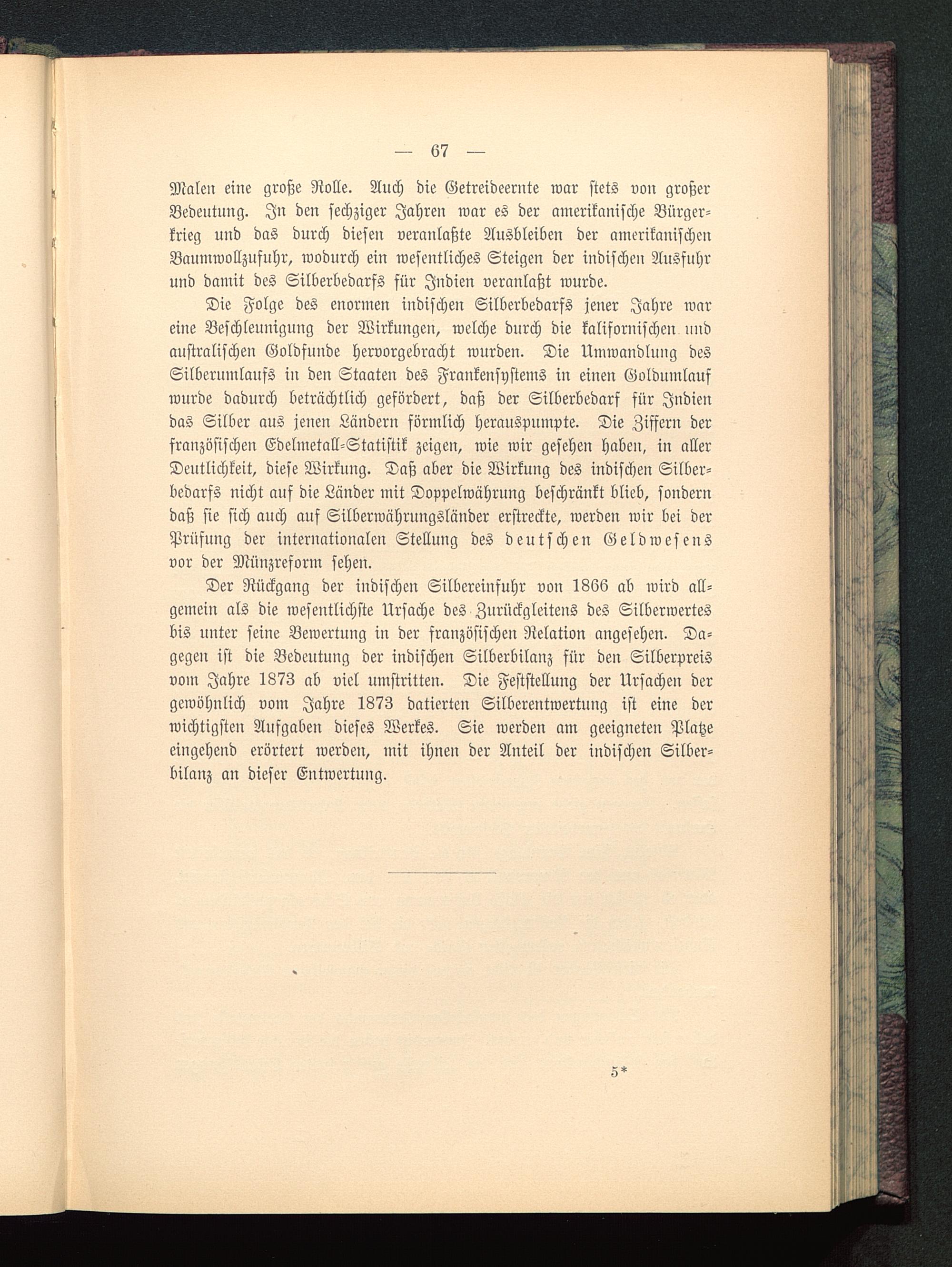 Der Rückgang der indischen Silbereinfuhr von 1866 ab wird all-gemein als die wesentlichste Ursache des Zurückgleitens des Silberwertesbis unter seine Bewertung in der französischen Relation angesehen. Da-gegen ist die Bedeutung der indischen Silberbilanz für den Silberpreisvom Jahre 1873 ab viel umstritten. Die Feststellung der Ursachen dergewöhnlich vom Jahre 1873 datierten Silberentwertung ist eine derwichtigsten Aufgaben dieses Werkes. Sie werden am geeigneten Platzeeingehend erörtert werden, mit ihnen der Anteil der indischen Silber-bilanz an dieser Entwertung.