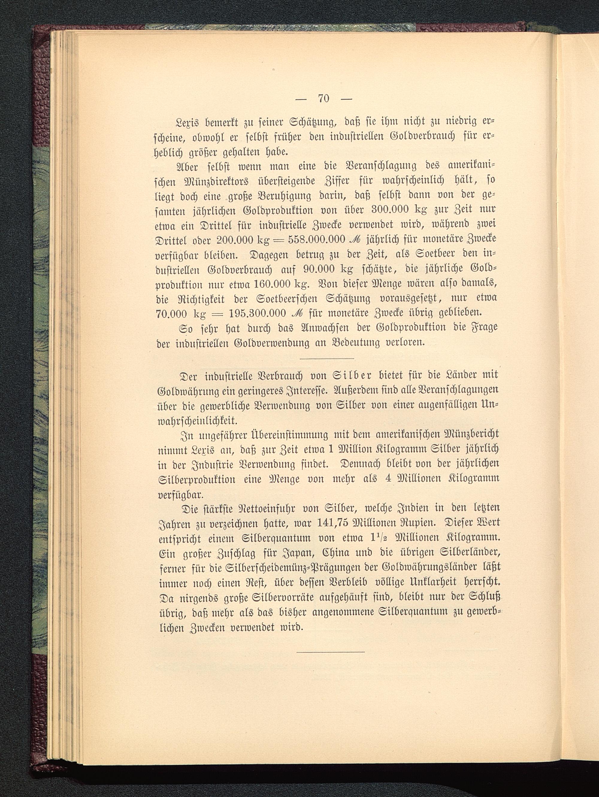 Lexis bemerkt zu seiner Schätzung, daß sie ihm nicht zu niedrig er-scheine, obwohl er selbst früher den industriellen Goldverbrauch für er-heblich größer gehalten habe.
