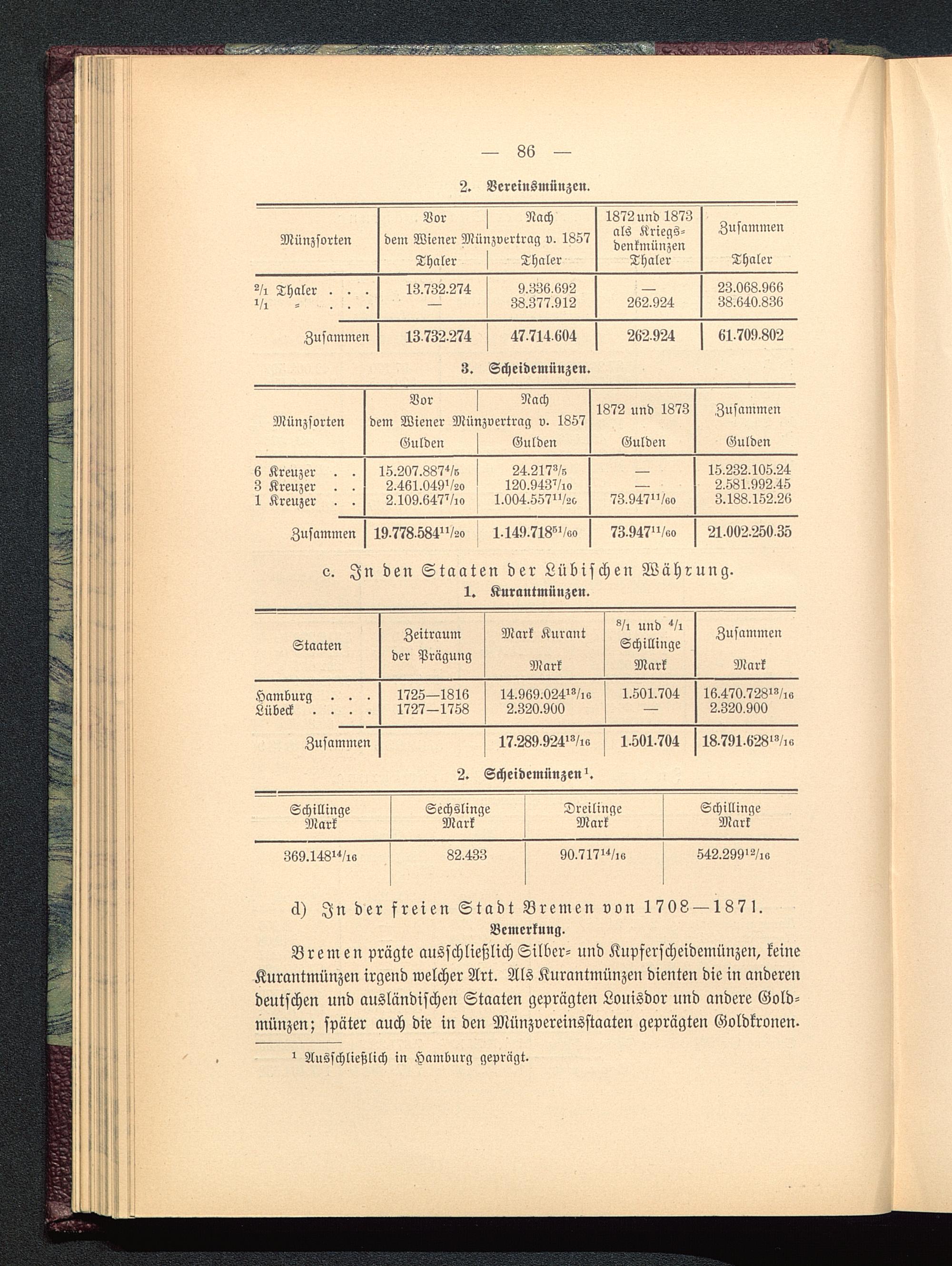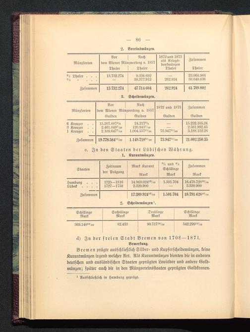 Bremen prägte ausschließlich Silber- und Kupserscheidemünzen, keineKurantmiinzen irgend welcher Art. Als Kurantmiinzen dienten die in andereildeutschen und ausländischen Staaten geprägten Louisdor und andere Gold-münzen; später auch die in den Münzvereinsstaaten geprägten Goldkronen.