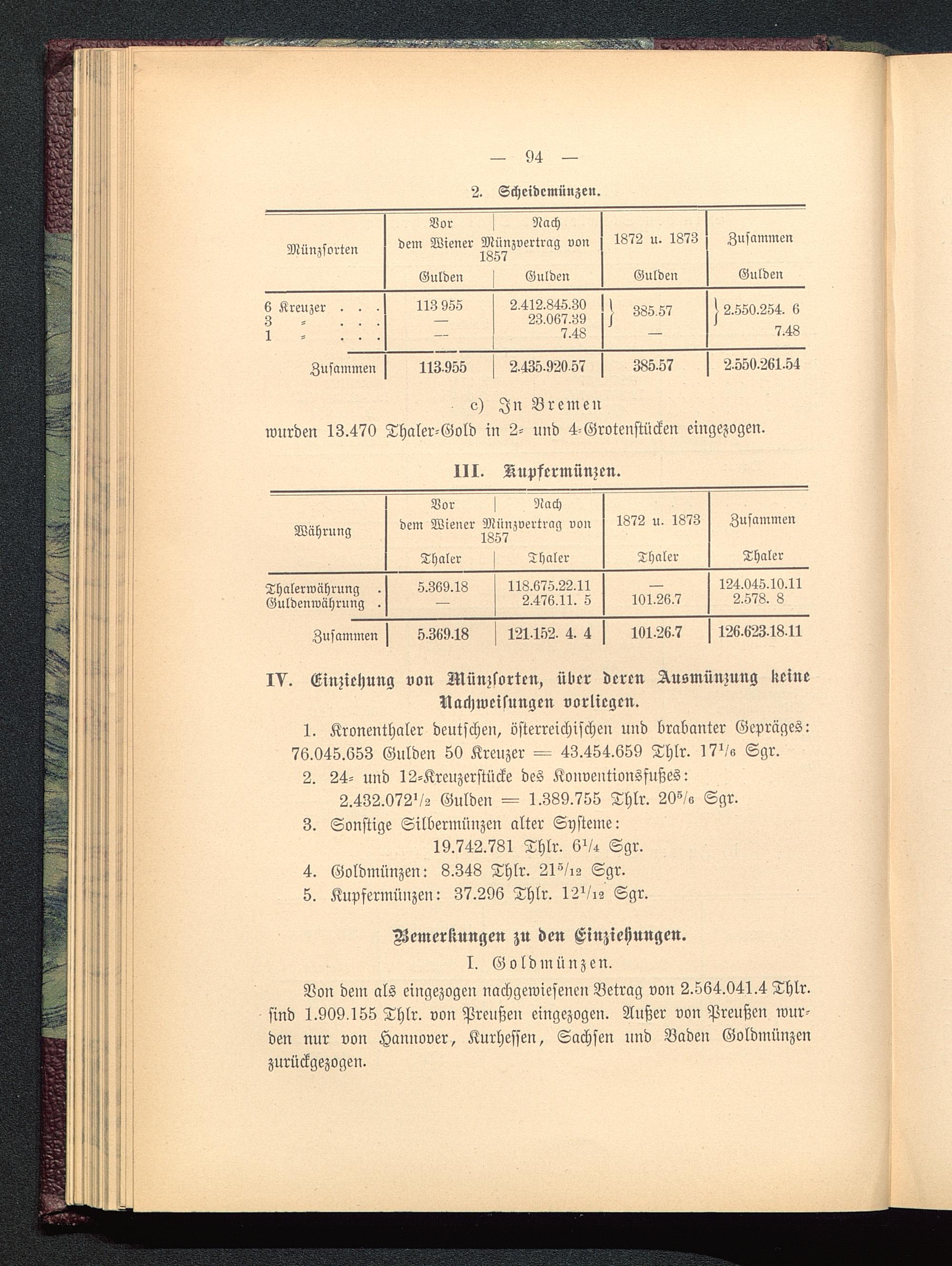 I. Goldmünzen.Von dein als eingezogen nachgewiesenen Betrag von 2.564.041.4 Thlr. sind 1.909455 Thlr. von Preußen eingezogen. Außer von Preußen wur-den nur von Hannover, Kurhessen , Sachsen und Baden Goldmünzenzurückgezogen.