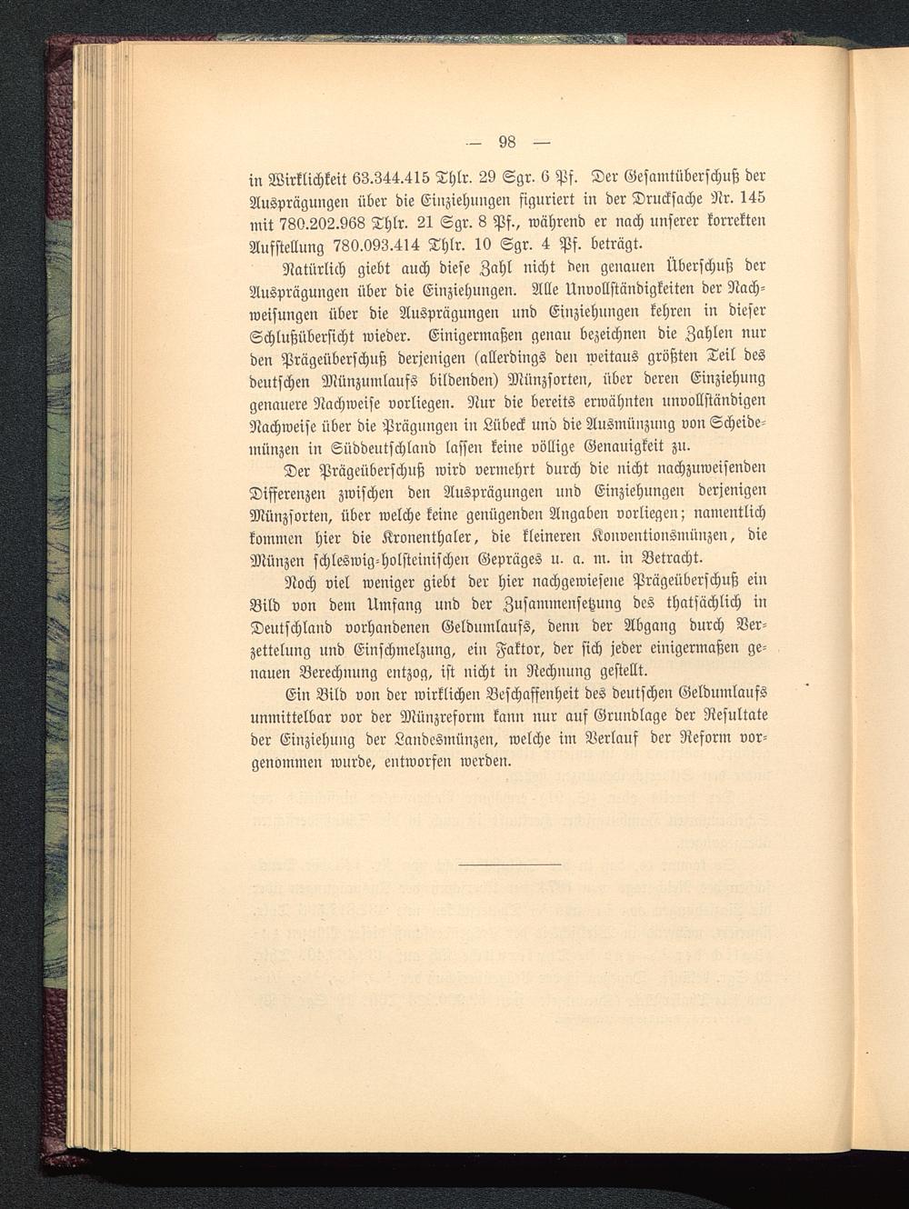 Der Prägeüberschnß wird vermehrt durch die nicht nachzuweisendenDifferenzen zwischen den Ausprägungen und Einziehungen derjenigenMünzsorten, über welche keine genügenden Angaben vorliegen; namentlichkommen hier die Kronenthaler, die kleineren Konventionsmünzen, dieMünzen schleswig-holsteinischen Gepräges u. a. m. in Betracht.