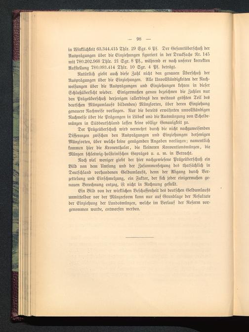 m Wirklichkeit 63.344.415 Thlr. 29 Sgr. 6 Pf. Der Gesamtüberschuß derAusprägungen über die Einziehungen figuriert in der Drucksache Nr. 145mit 780.202.968 Thlr. 21 Sgr. 8 Pf., während er nach unserer korrektenAufstellung 780.093.414 Thlr. 10 Sgr. 4 Pf. beträgt.