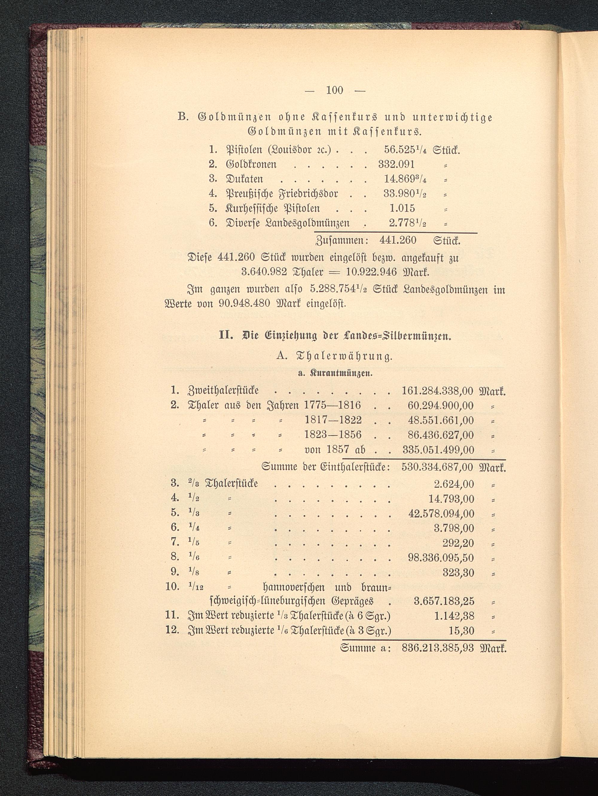 3.640.982 Thaler ^ 10.922.946 Mark.Im ganzen wurden also 5.288.754^2 Stück Landesgoldmünzen imWerte von 90.948.480 Mark eingelöst.