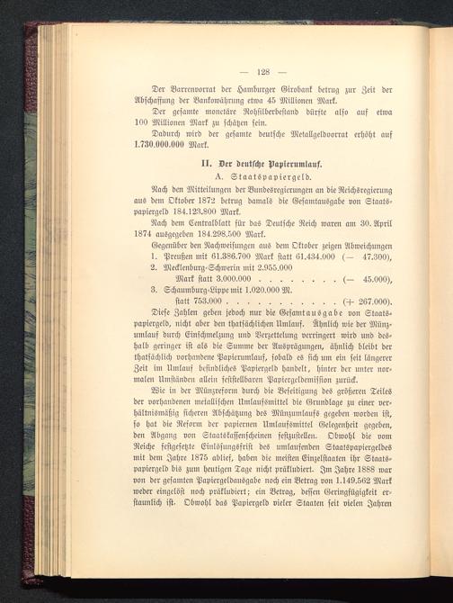 Nach den Mitteilungen der Bundesregierungen an die Reichsregierungaus dem Oktober 1872 betrug damals die Gesamtausgabe von Staats-papiergeld 184.123.800 Mark.