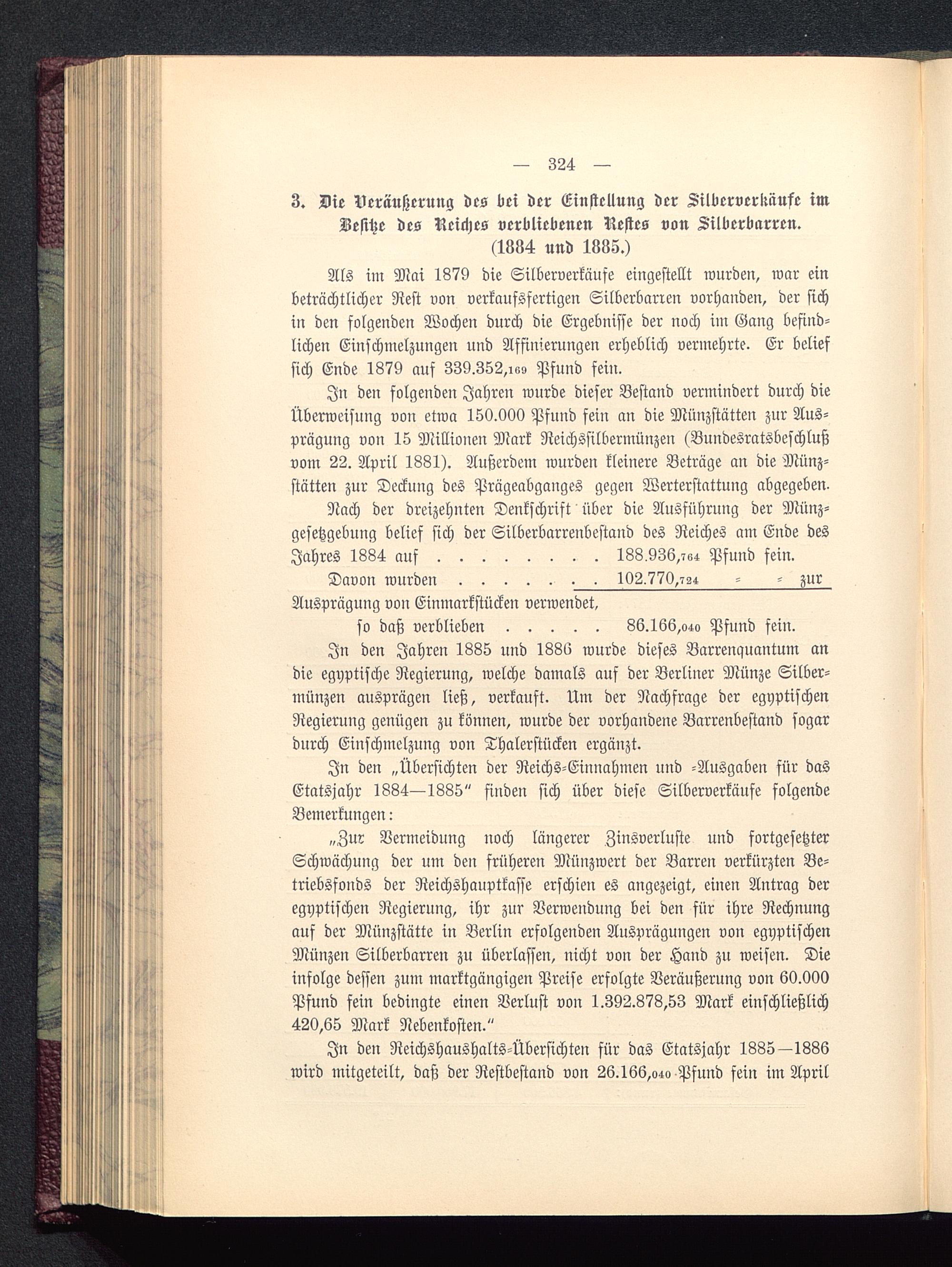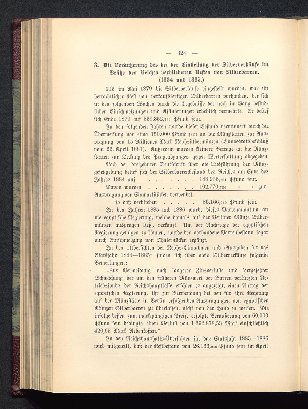 3. Die Veräußerung des bei der Einstellung der Silberverkiiufe imBesitze des Reiches verbliebenen Nestes von Silberbarren.(1884 und 1835.)