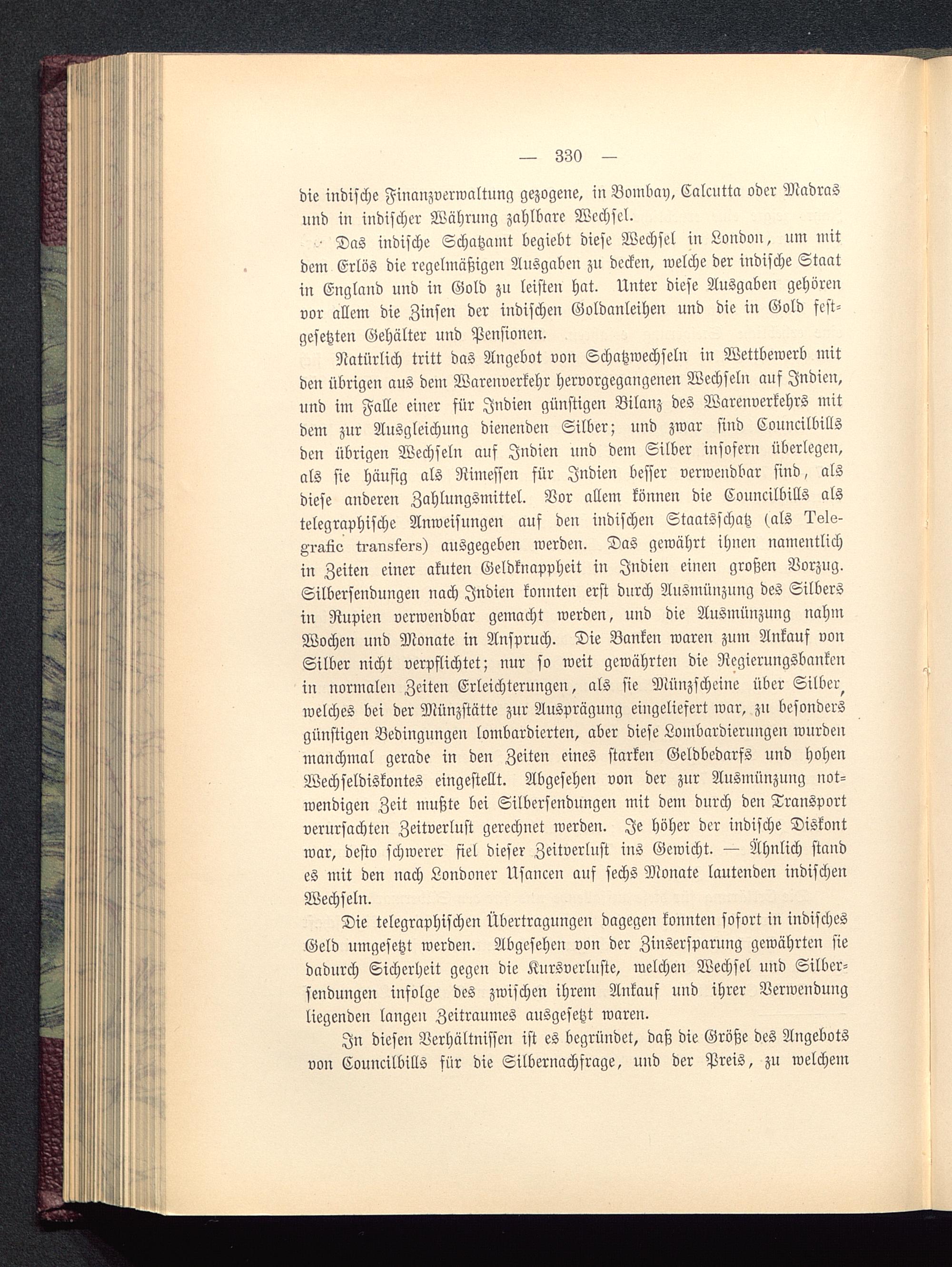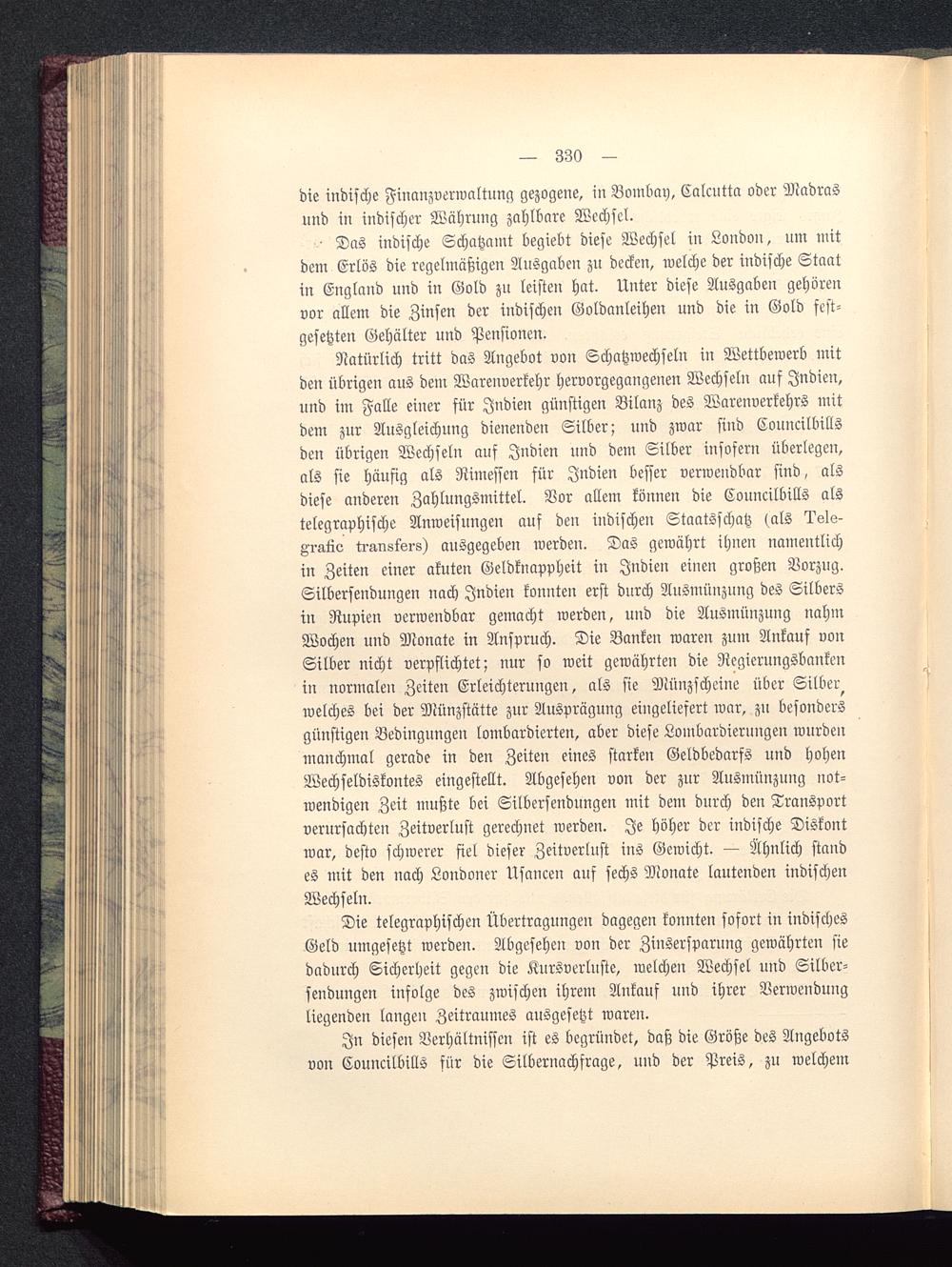 Die telegraphischen Übertragungen dagegen konnten sofort in indischesGeld umgesetzt werden. Abgesehen von der Zinsersparung gewährten siedadurch Sicherheit gegen die Kursverluste, welchen Wechsel und Silber-sendungen infolge des zwischen ihrem Ankauf und ihrer Verwendungliegenden langen Zeitraumes ausgesetzt waren.