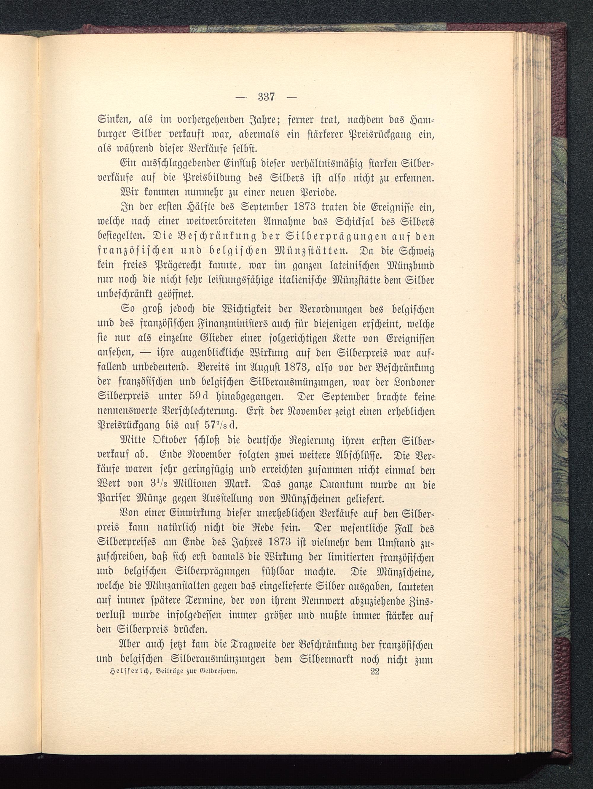 In der ersten Hälfte des September 1873 traten die Ereignisse ein,welche nach einer weitverbreiteten Annahme das Schicksal des Silbersbesiegelten. Die Beschränkung der Silberprägungen auf denfranzösischen und belgischen Münzstätten. Da die Schweiz kein freies Prägerecht kannte, war im ganzen lateinischen Münzbundnur noch die nicht sehr leistungsfähige italienische Münzstätte dem Silberunbeschränkt geöffnet.