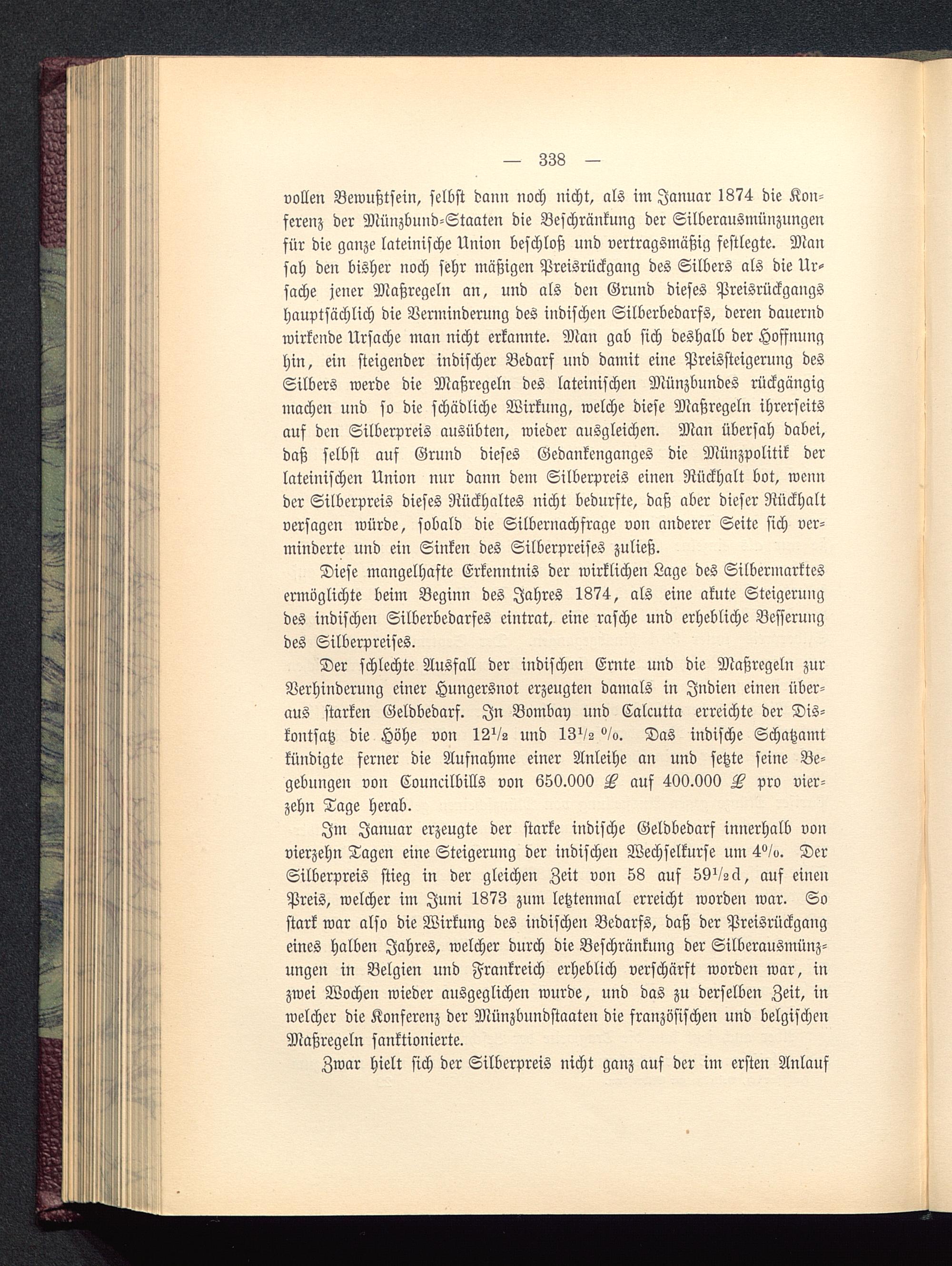 Diese mangelhafte Erkenntnis der wirklichen Lage des Silbermarktesermöglichte beim Beginn des Jahres 1874, als eine akute Steigerungdes indischen Silberbedarfes eintrat, eine rasche und erhebliche Besserungdes Silberpreises.