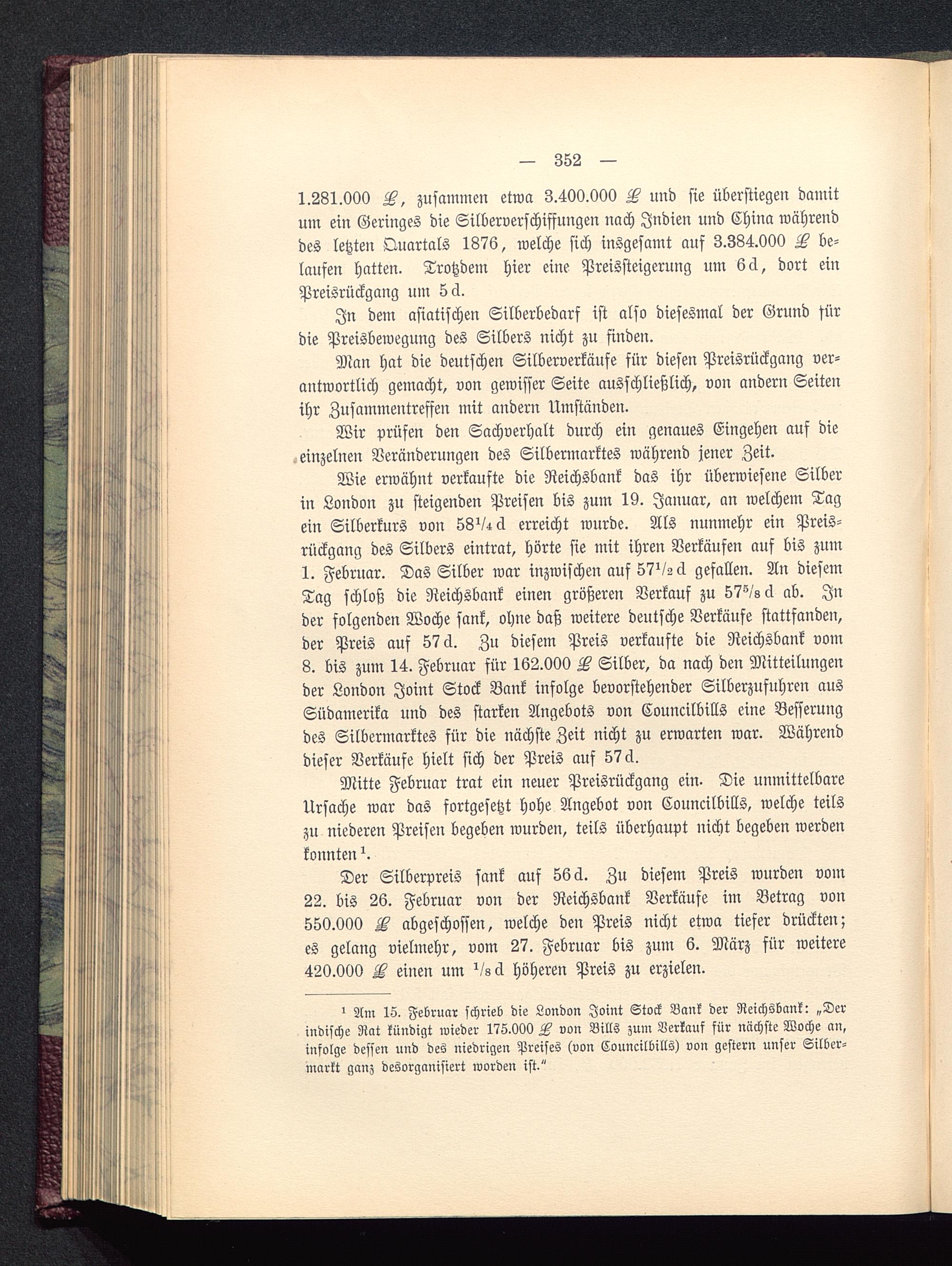 Der Silberpreis sank auf 56 ä. Zu diesem Preis wurden vom22. bis 26. Februar von der Reichsbank Verkäufe im Betrag von550.000 F abgeschossen, welche den Preis nicht etwa tiefer drückten;es gelang vielmehr, vom 27. Februar bis zum 6. März für weitere420.000 F einen um ^/s ä höheren Preis zu erzielen.