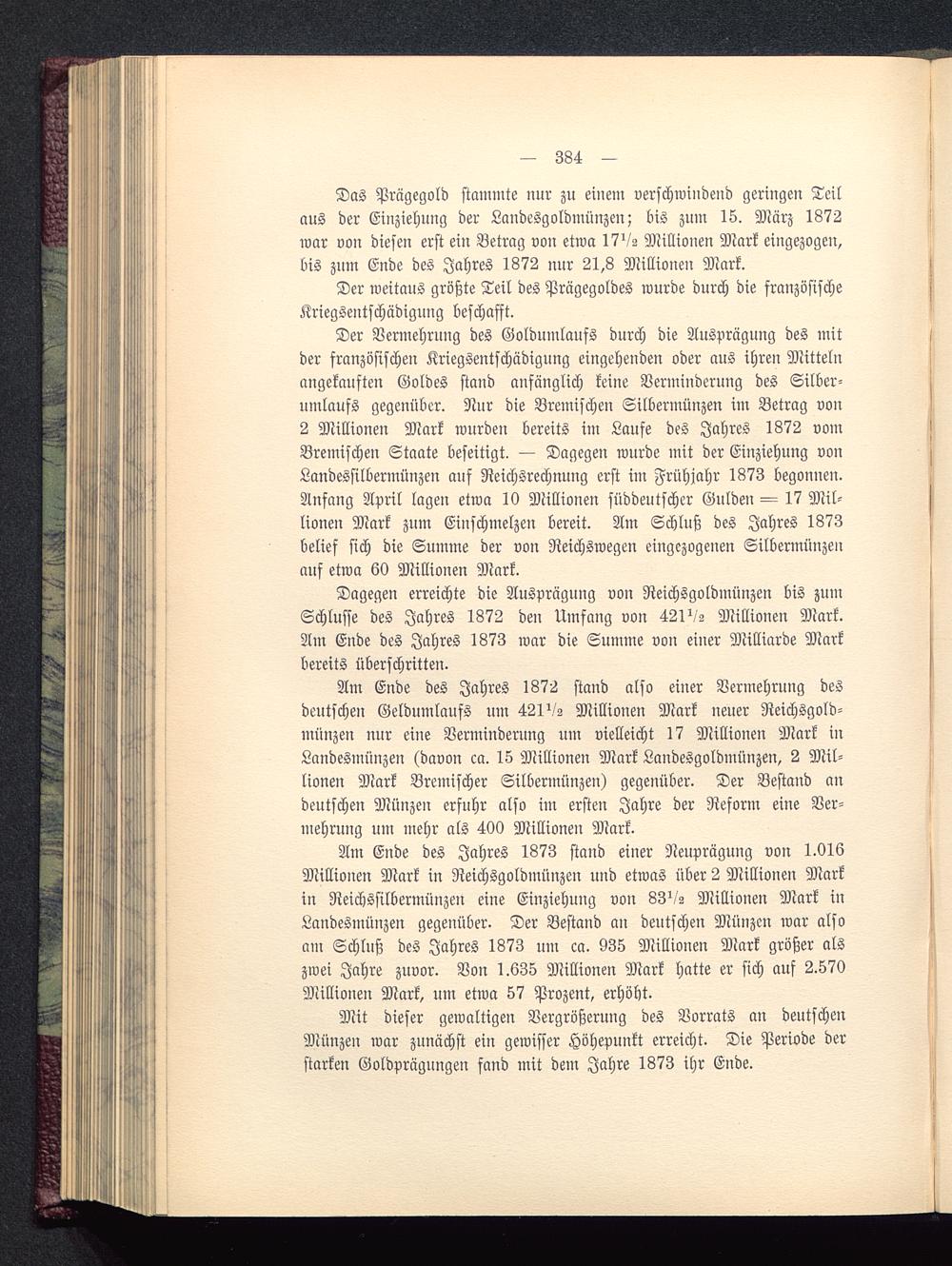Dagegen erreichte die Ausprägung von Reichsgoldmünzen bis zumSchlüsse des Jahres 1872 den Umfang von 4211/2 Millionen Mark.Am Ende des Jahres 1873 war die Summe von einer Milliarde Markbereits überschritten.