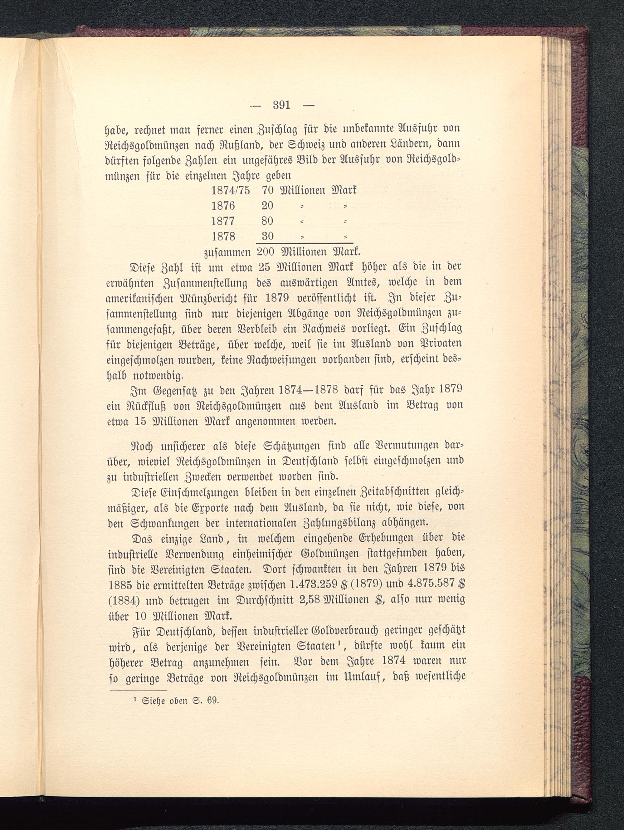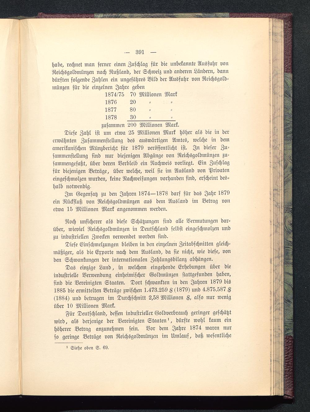 Für Deutschland , dessen industrieller Goldverbrauch geringer geschätztwird, als derjenige der Vereinigten Staaten ', dürfte wohl kaum einhöherer Betrag anzunehmen sein. Vor dem Jahre 1874 waren nurso geringe Beträge von Reichsgoldmünzen im Umlauf, daß wesentliche