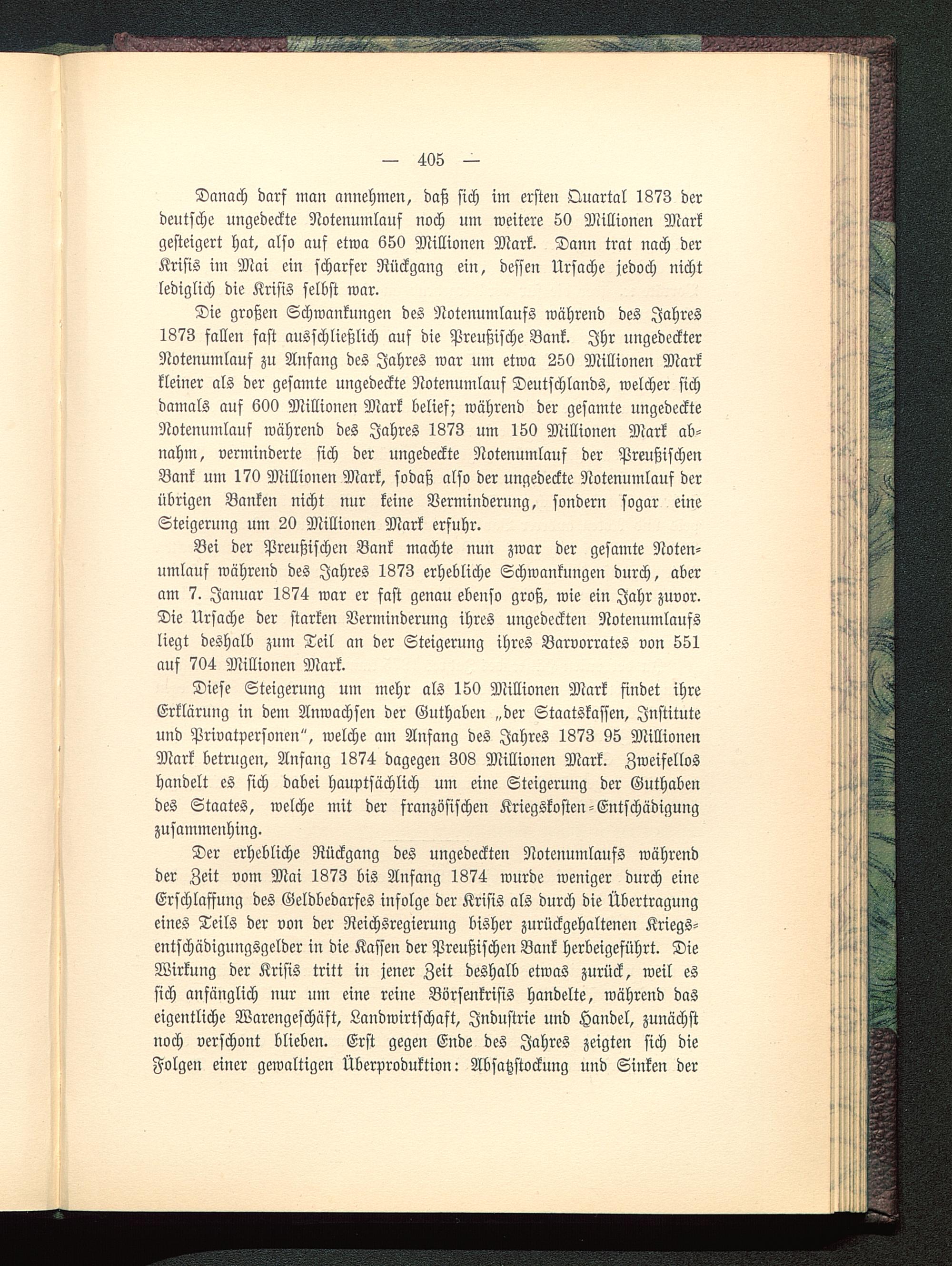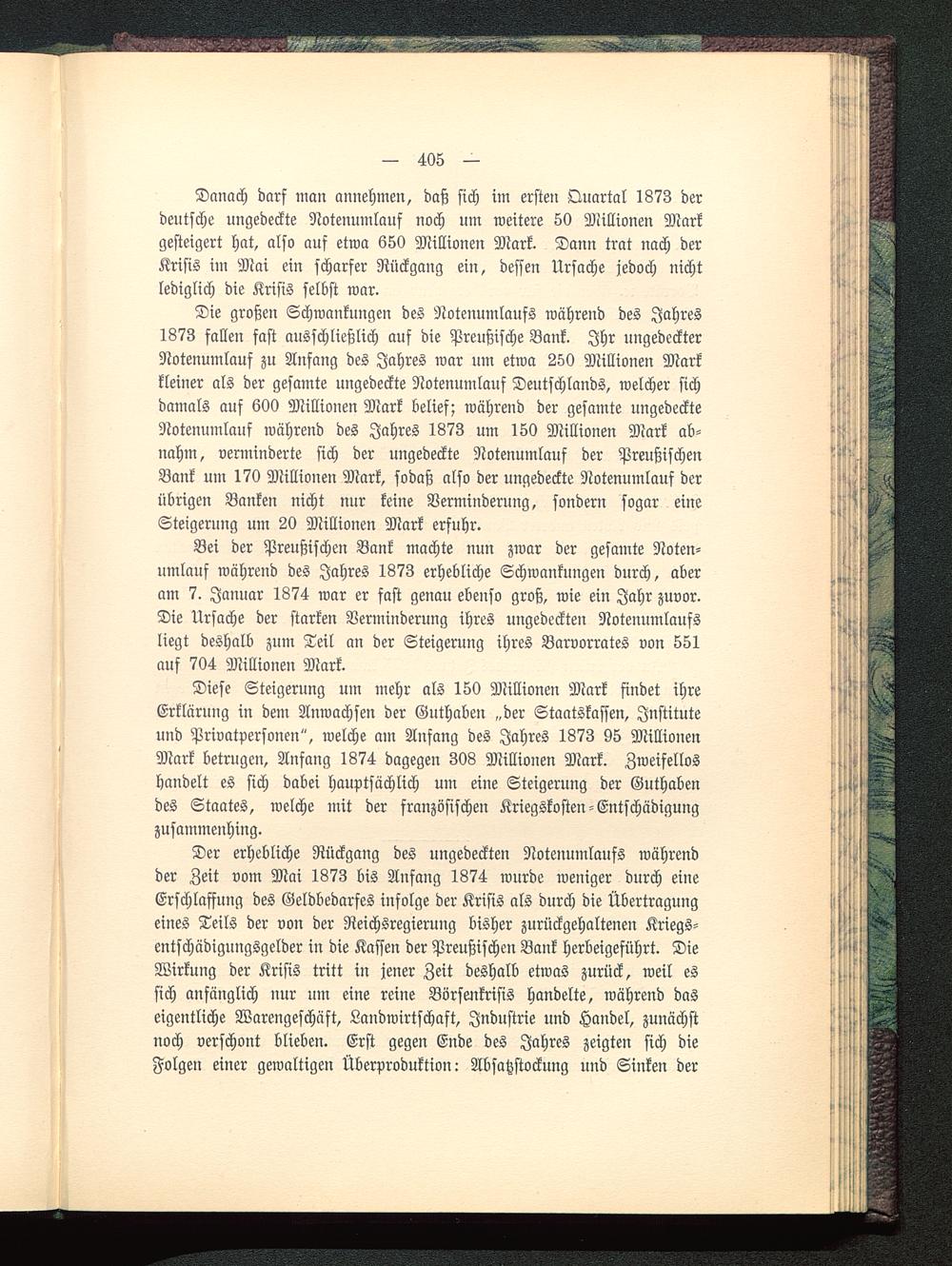 Die großen Schwankungen des Notenumlaufs während des Jahres1873 fallen fast ausschließlich auf die Preußische Bank . Ihr ungedeckterNotenumlauf zu Anfang des Jahres war um etwa 250 Millionen Markkleiner als der gesamte ungedeckte Notenumlauf Deutschlands , welcher sichdamals auf 600 Millionen Mark belief; während der gesamte ungedeckteNotenumlauf während des Jahres 1873 um 150 Millionen Mark ab-nahm, verminderte sich der ungedeckte Notenumlauf der PreußischenBank um 170 Millionen Mark, sodaß also der ungedeckte Notenumlauf derübrigen Banken nicht nur keine Verminderung, sondern sogar eineSteigerung um 20 Millionen Mark erfuhr.