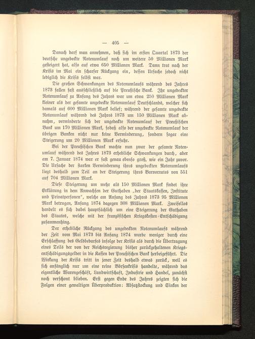 Danach darf man annehmen, daß sich im ersten Quartal 1873 derdeutsche ungedeckte Notenumlauf noch um weitere 50 Millionen Markgesteigert hat, also auf etwa 650 Millionen Mark. Dann trat nach derKrisis im Mai ein scharfer Rückgang ein, dessen Ursache jedoch nichtlediglich die Krisis selbst war.