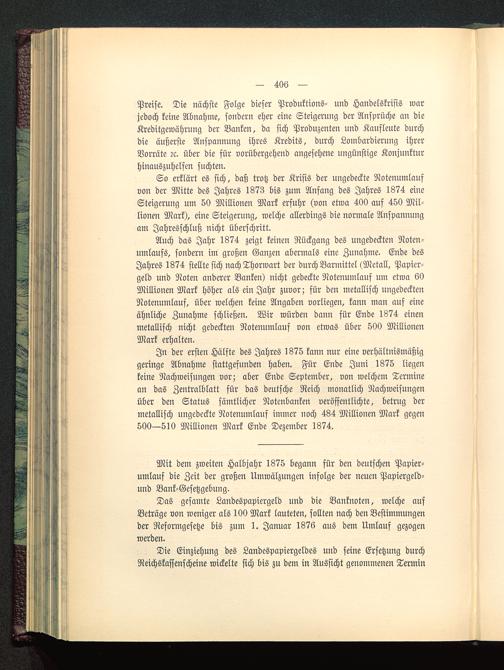 So erklärt es sich, daß trotz der Krisis der ungedeckte Notenumlaufvon der Mitte des Jahres 1873 bis zum Anfang des Jahres 1874 eineSteigerung um 50 Millionen Mark erfuhr (von etwa 400 auf 450 Mil-lionen Mark), eine Steigerung, welche allerdings die normale Anspannungam Jahresschluß nicht überschritt.