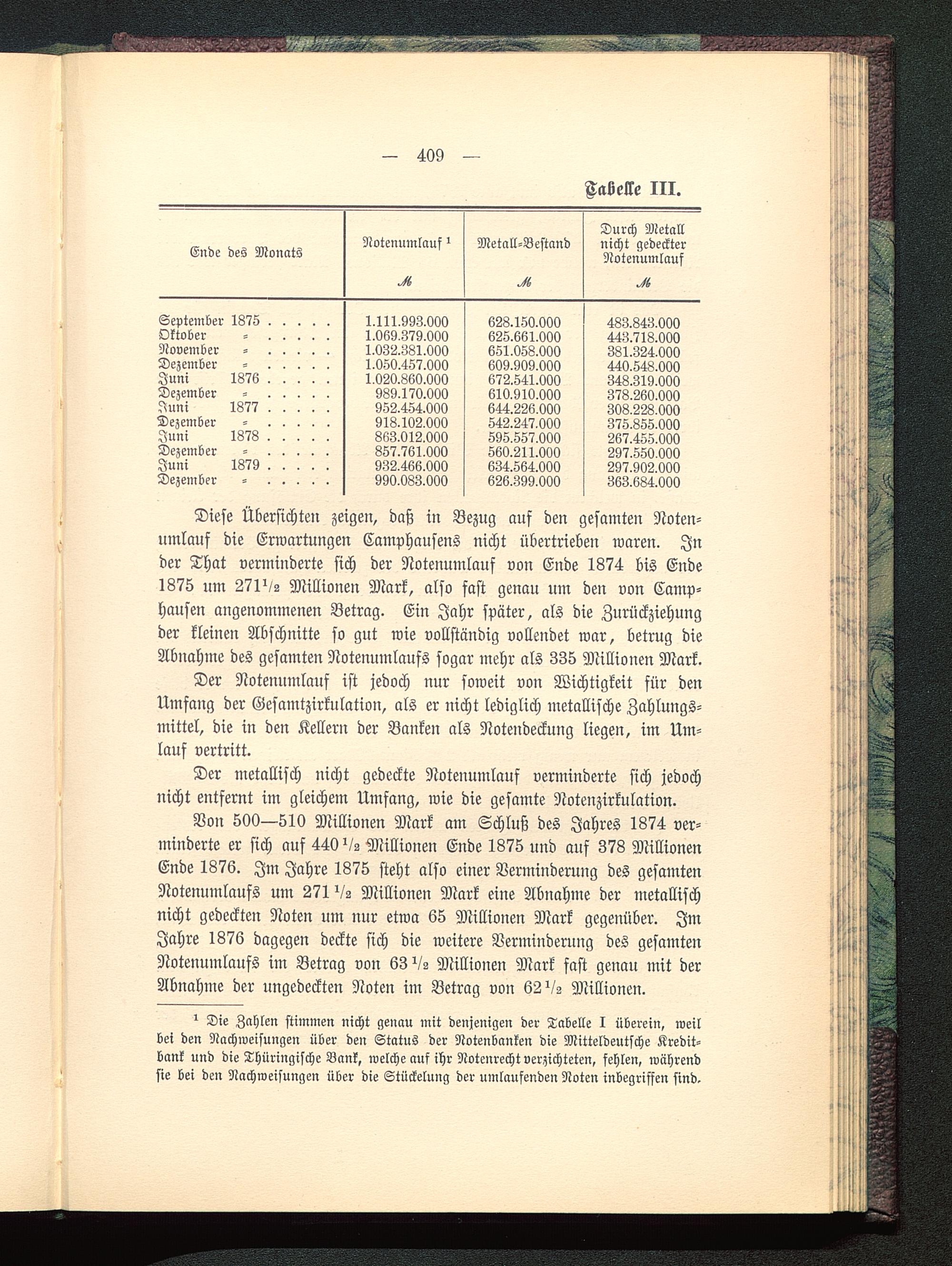 Diese Übersichten zeigen, daß in Bezug aus den gesamten Noten-umlauf die Erwartungen Camphausens nicht übertrieben waren. Inder That verminderte sich der Notenumlauf von Ende 1874 bis Ende1875 um 271^/s Millionen Mark, also fast genan um den von Camp-hausen angenommenen Betrag. Ein Jahr später, als die Zurückziehungder kleinen Abschnitte so gut wie vollständig vollendet war, betrug dieAbilahme des gesamten Notenumlaufs sogar mehr als 335 Millionen Mark.