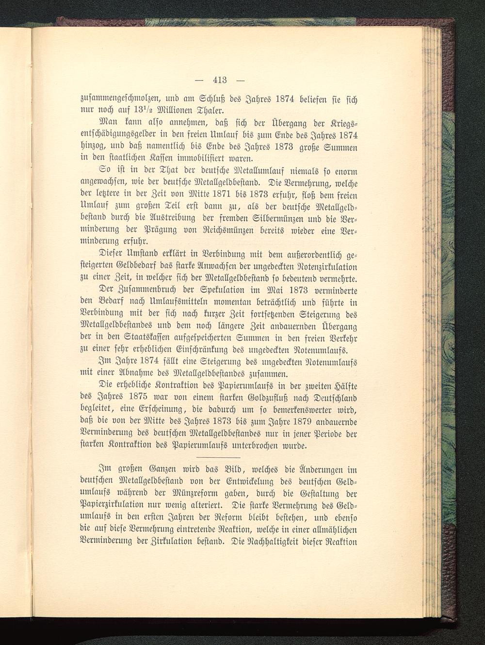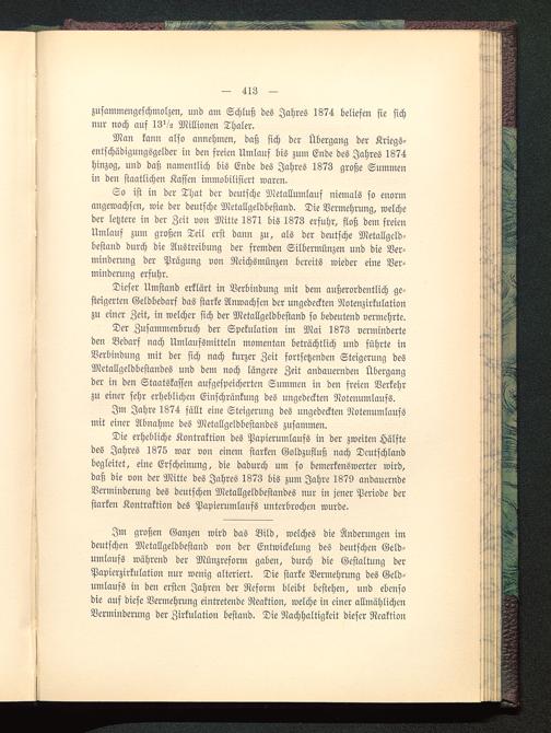 Der Zusammenbruch der Spekulation im Mai 1873 verminderteden Bedarf nach Umlaufsmitteln momentan beträchtlich und führte inVerbindung mit der sich nach kurzer Zeit fortsetzenden Steigerung desMetallgeldbestandes und dem noch längere Zeit andauernden Übergangder in den Staatskassen aufgespeicherten Summen in den freien Verkehrzu einer sehr erheblichen Einschränkung des ungedeckten Notenumlaufs.