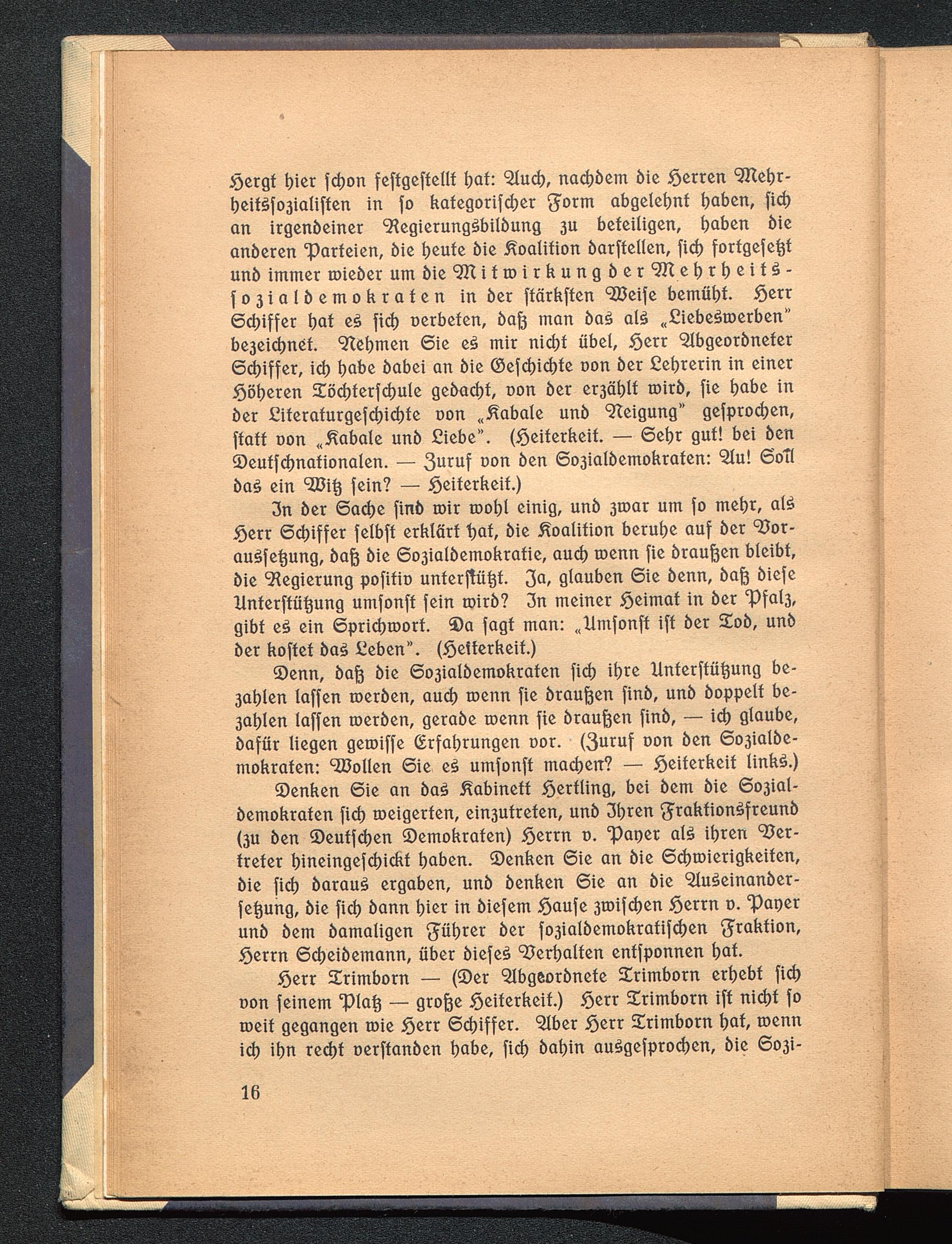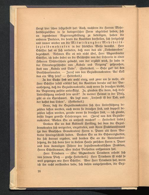 Hergt hier schon festgestellt hat: Auch, nachdem die Herren Mehr-heitssozialisten in so kategorischer Form abgelehnt haben, sichan irgendeiner Regierungsbildung zu beteiligen, haben dieanderen Parteien, die heute die Koalition darstellen, sich fortgesetztund immer wieder umdieMitwirkungder M e hrheits -sozialdemokraten in der stärksten Weise bemüht. HerrSchiffer hat es sich verbeten, daß man das als ..Liebeswerben"bezeichnet. Nehmen Sie es mir nicht übel, Herr AbgeordneterSchiffer, ich habe dabei an die Geschichte von der Lehrerin in einerHöheren Töchterschule gedacht, von der erzählt wird, sie habe inder Literaturgeschichte von „Kabale und Neigung" gesprochen,statt von ..Kabale und Liebe". (Heiterkeit. — Sehr gut! bei denDeutschnationalen. — Zuruf von den Sozialdemokraten: Au! So7ldas ein Witz sein? — Heiterkeit.)