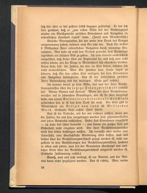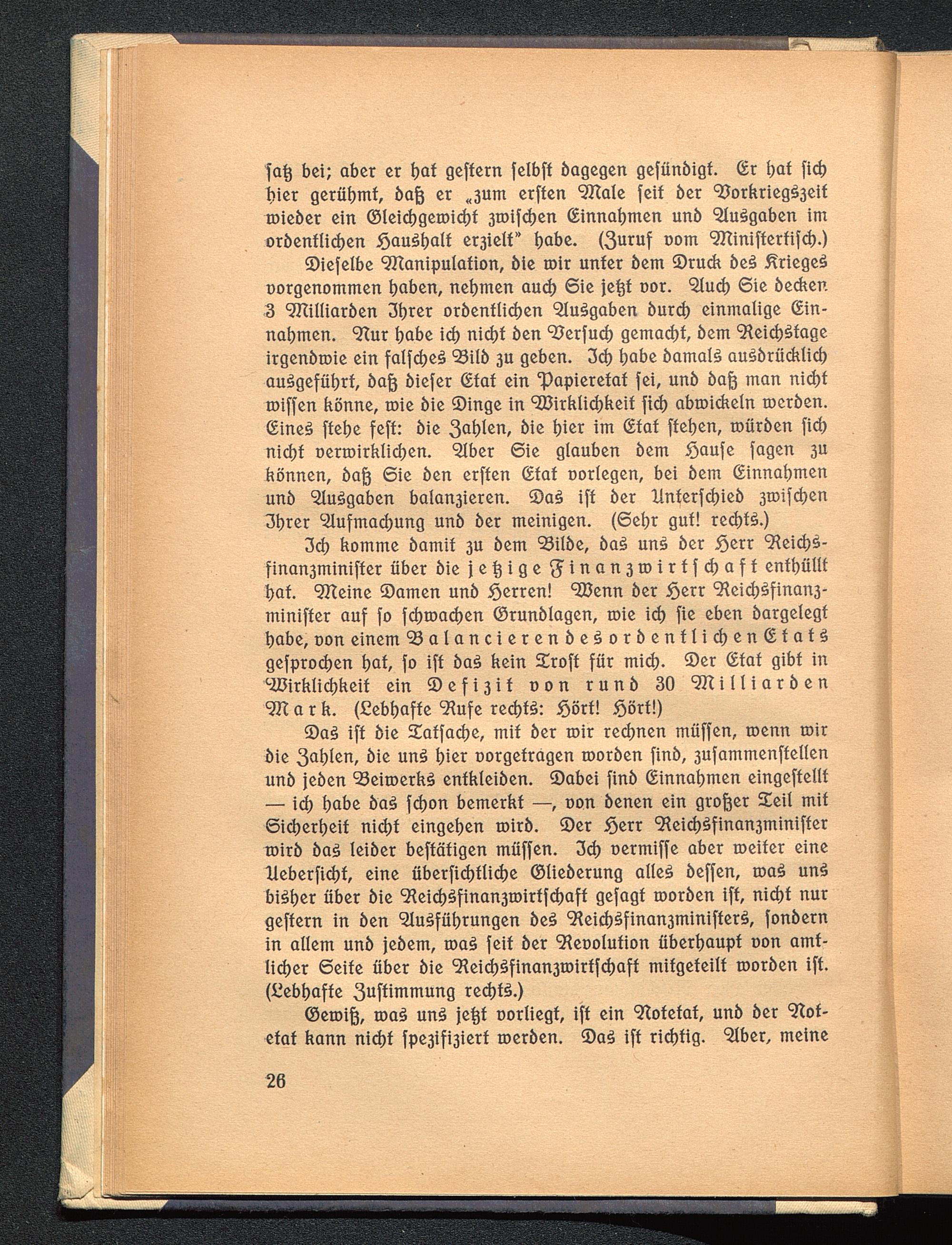 Ich komme damit zu dem Bilde, das uns der Herr Reichs-finanzminister über die jetzige Finanzwirtschaft enthüllthat. Meine Damen und Herren! Wenn der Herr Reichsfinanz-minister auf so schwachen Grundlagen, wie ich sie eben dargelegthabe, von einem BalancierendesordentlichenEtatsgesprochen hat, so ist das kein Trost für mich. Der Etat gibt inWirklichkeit ein Defizit von rund 30 MilliardenMark. (Lebhafte Rufe rechts: Hört! Hört!)