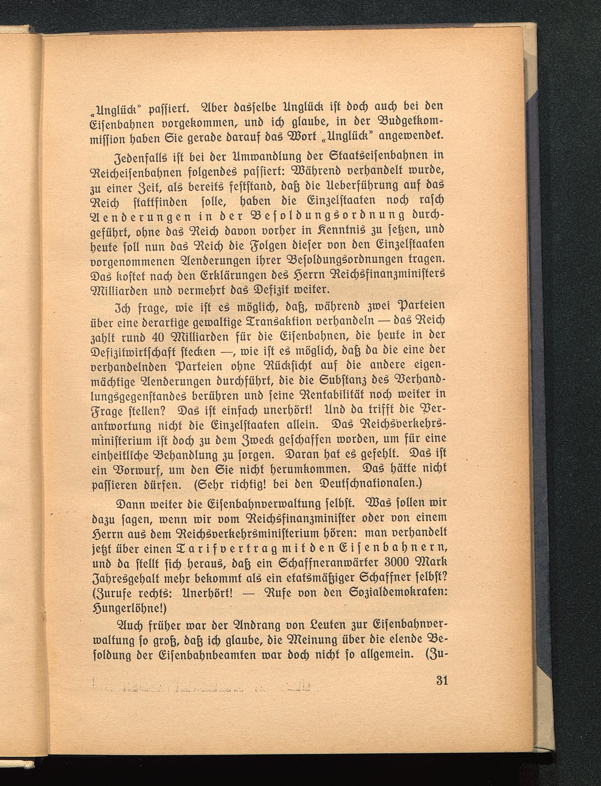 Jedenfalls ist bei der Umwandlung der Staatseisenbahnen inReicheisenbahnen folgendes passiert: Während verhandelt wurde,zu einer Zeit, als bereits feststand, daß die Ueberführung auf dasReich stattfinden solle, haben die Einzelstaaten noch raschAenderungen in der Besoldungsordnung durch-geführt, ohne das Reich davon vorher in Kenntnis zu setzen, undheute soll nun das Reich die Folgen dieser von den Einzelstaatenvorgenommenen Aenderungen ihrer Besoldungsordnungen tragen.Das kostet nach den Erklärungen des Herrn ReichsfinanzministersMilliarden und vermehrt das Defizit weiter.